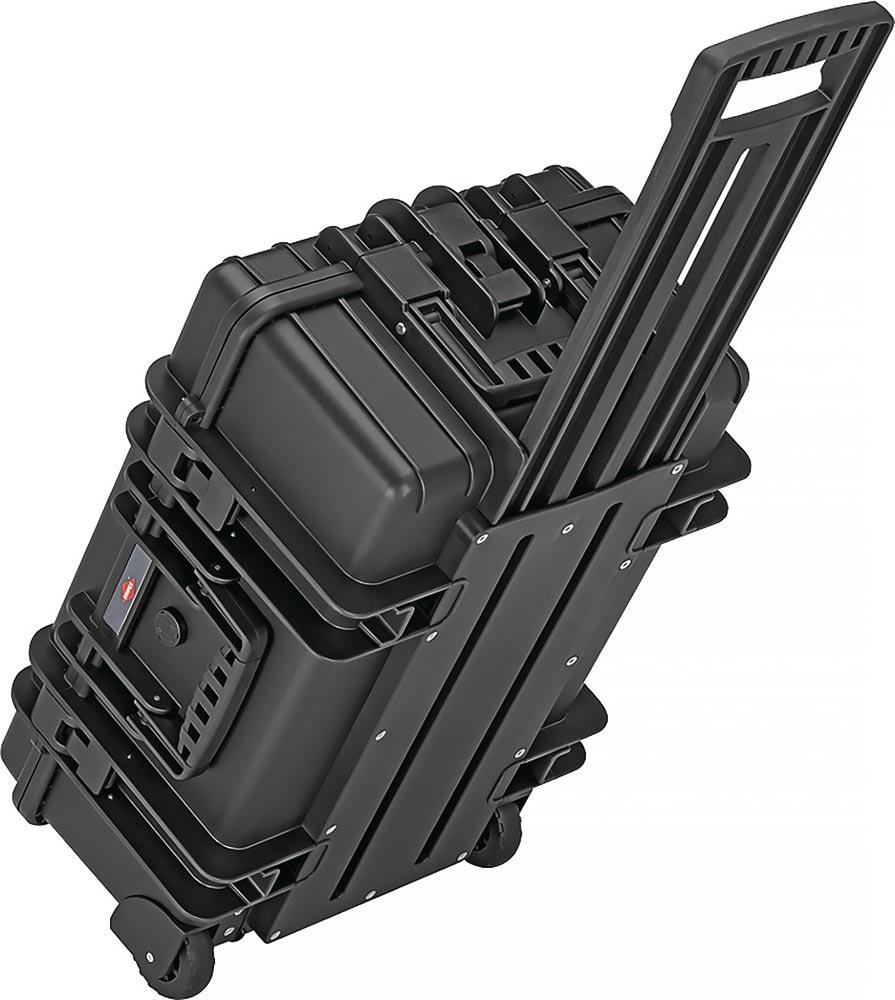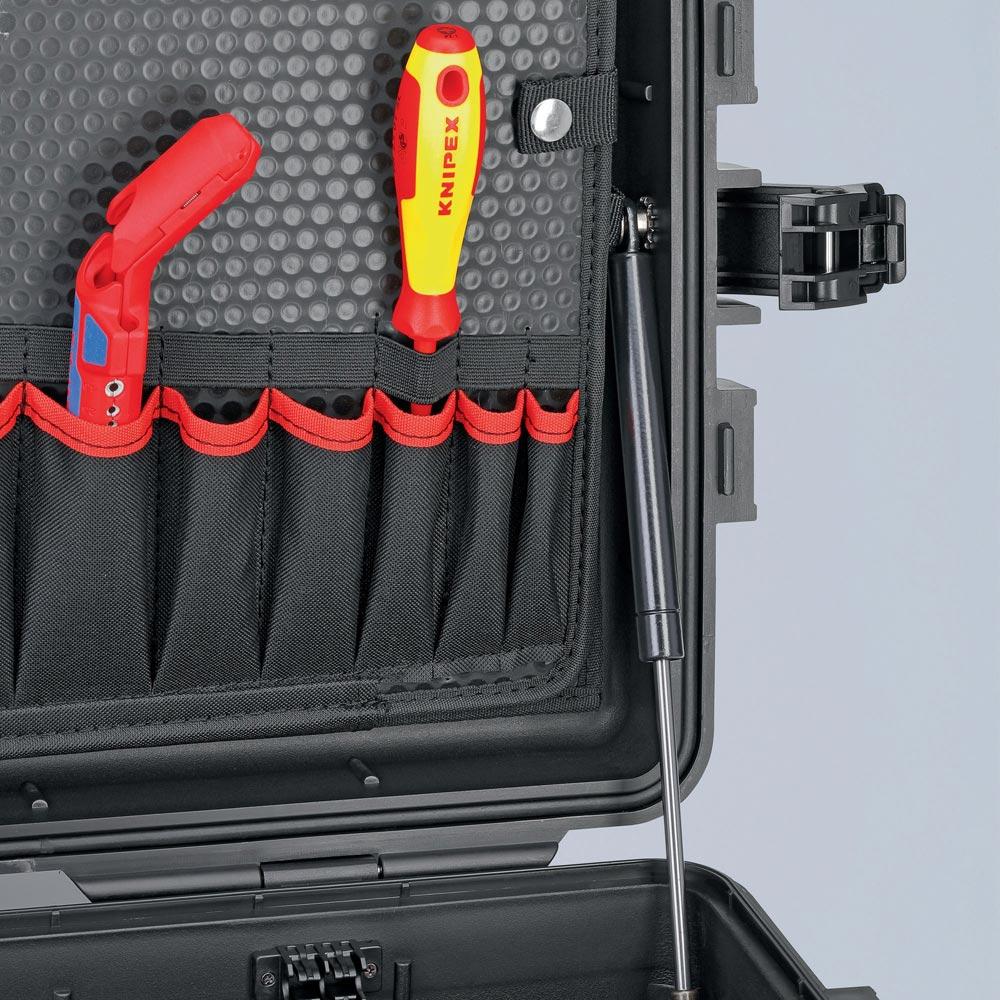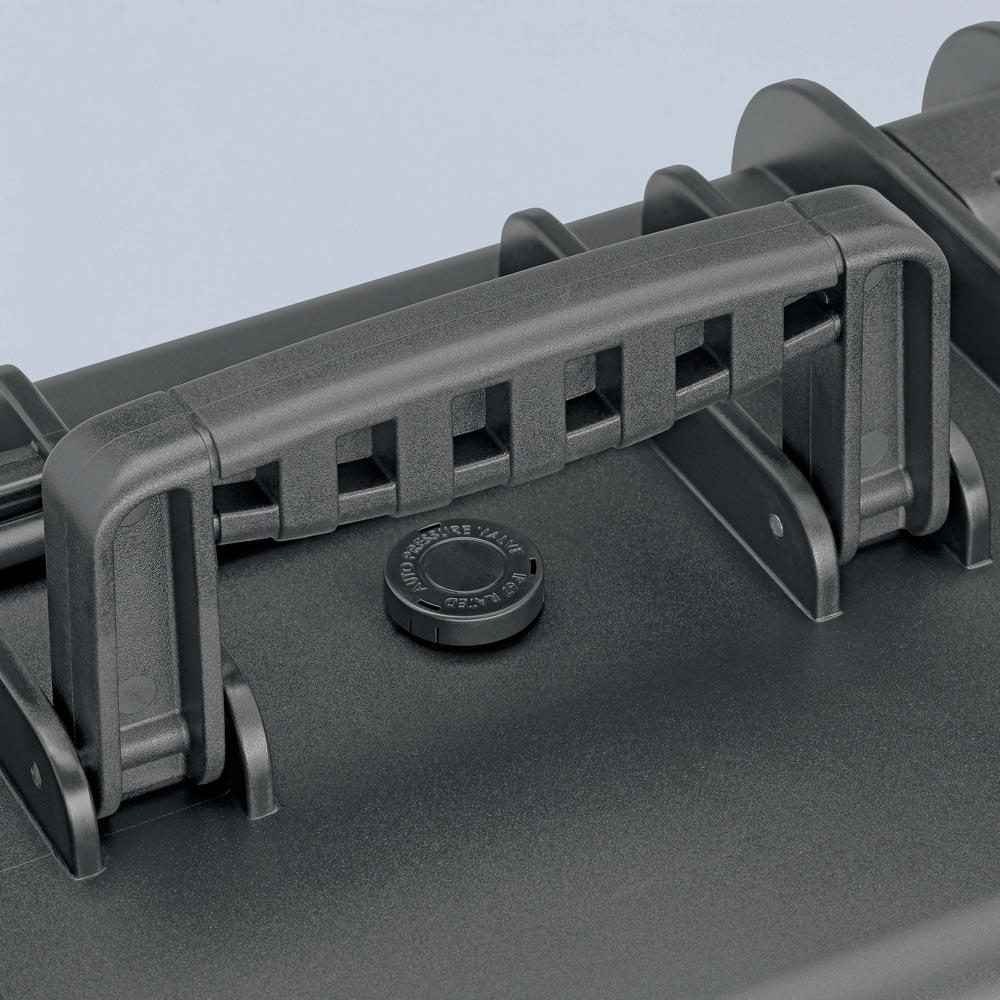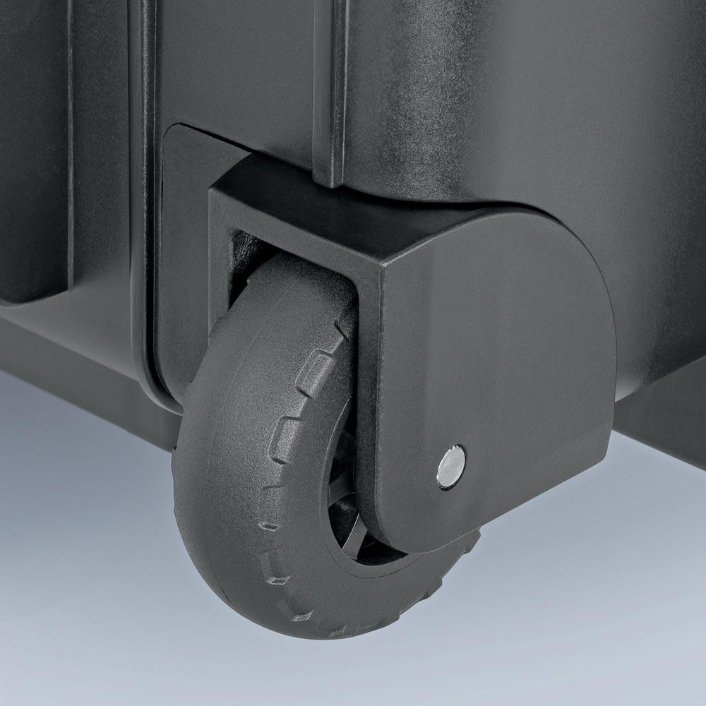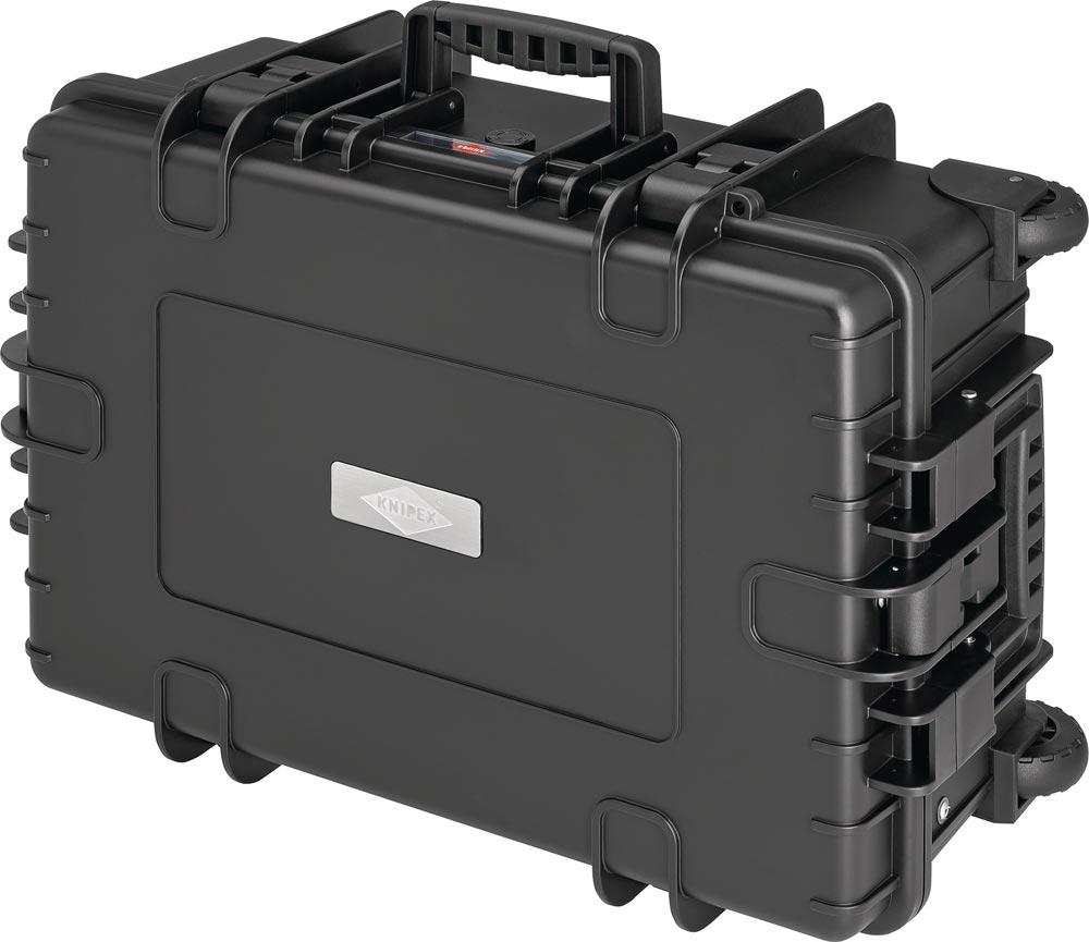 Staub- und wasserdicht · flugtauglich · aus schlagfestem Polypropylen · automatisches Druckausgleichventil · Temperaturstabil von - 30°C bis + 80°C · Vorrichtung für Vorhängeschloss (gehört nicht zum Lieferumfang) · Dokumentenfach · Werkzeugtafeln aus Con-Pearl® mit 54 bestückbaren Werkzeugtaschen und 94 Werkzeugschlaufen · verschließbare Bodenschale (individuell unterteilbar durch Aluminium-Trennstegesystem) · Zweikomponenten-Griff · integriertes Fahrgestell mit zwei leicht laufenden Rollen und Teleskopgriff · Volumen 45 Liter · max. belastbar bis 35 kg