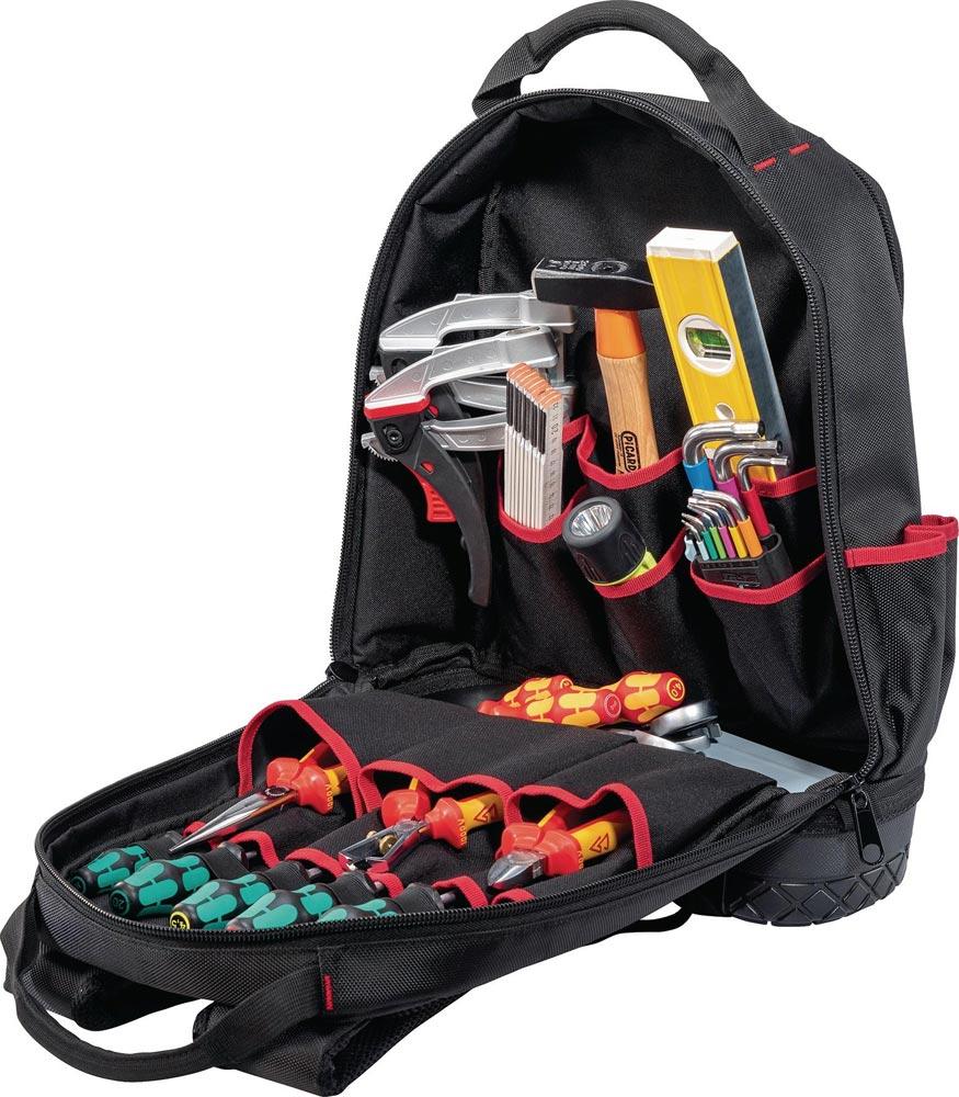 aus hochwertig verarbeitetem Nylon · kunststoffverstärkter Boden gegen Abnutzung, extrem langlebig · gepolsterte Rückwand und gepolsterte Schulterriemen · für bis zu 50 Werkzeugen in 15 Einsteckfächern, 6 Gummischlaufen und 4 weiteren großzügigen Staufächern, sowie 1 Laptop-Fach (13,3") · mit separatem Maßbandhalter und Schlüsselanhänger