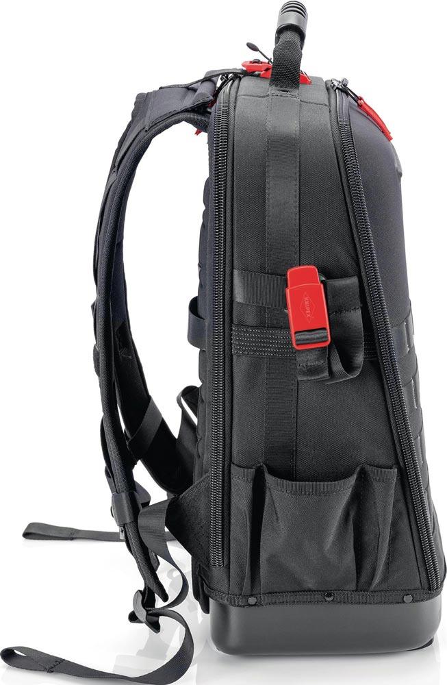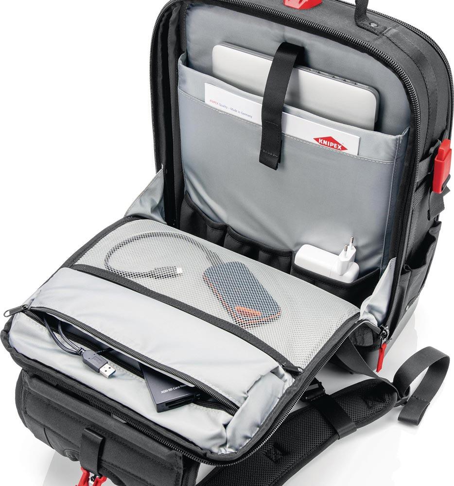 aus nachhaltigen Recycling-Kunstfasern · komplett aufklappbare Vorder- und Rückseite · herausnehmbare Werkzeugtafel und ergonomischer Rückenpolsterung · 2 separate Innenfächern für Werkzeug, Messgeräte, Notebook oder Tablet · innen 1 und außen 4 MOLLE-Bänder zur Befestigung von beliebigen Adaptern, Karabinern, Zubehör je nach Bedarf · 21 Haltelaschen und 37 Taschen, teilweise mit Reißverschlüssen · mit Kofferlasche zur Fixierung an Teleskopgriffen von Werkzeugkoffern · Leergewicht 2,9 kg · geprüfte Belastbarkeit bis 15 kg Werkzeuggewicht