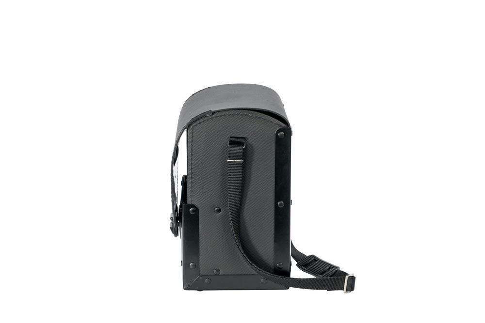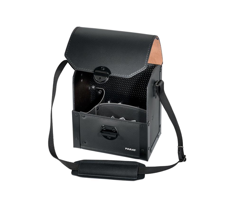 aus Rindsleder · schwarz · aluwinkelverstärkter Taschenkörper · Bodengleiter · Vorder-, Rück- und Mittelwand mit 17 Einsteckfächern · durchsichtiges Klemmfach im Deckel · Trageriemen · verstellbar · abschließbares Steckschloss