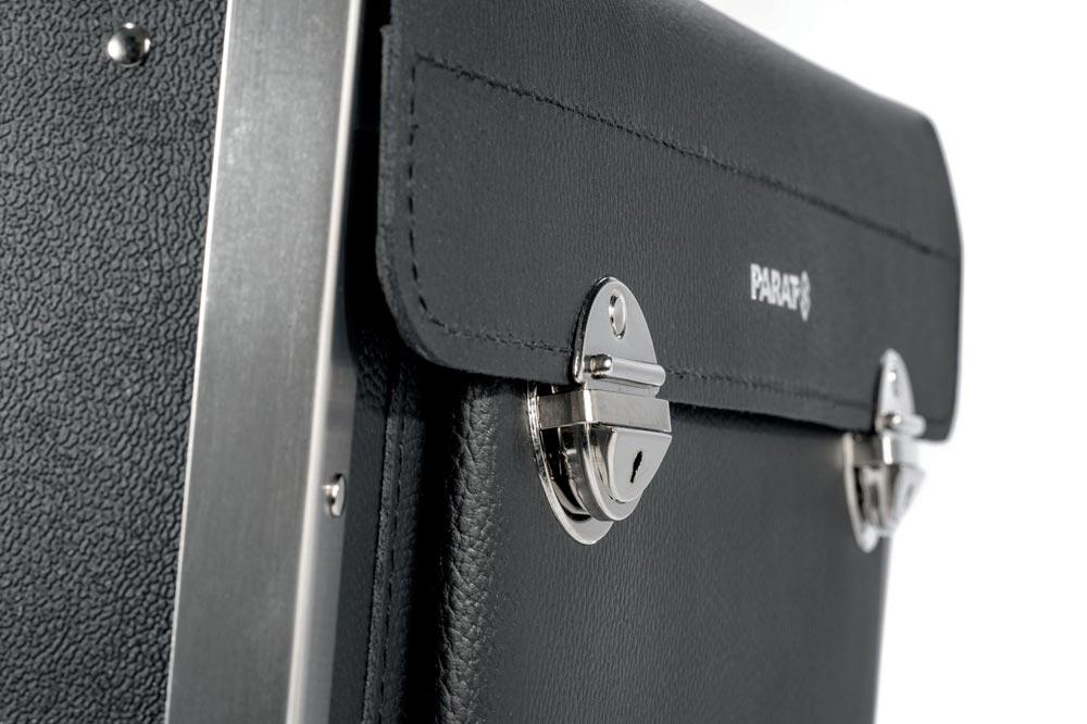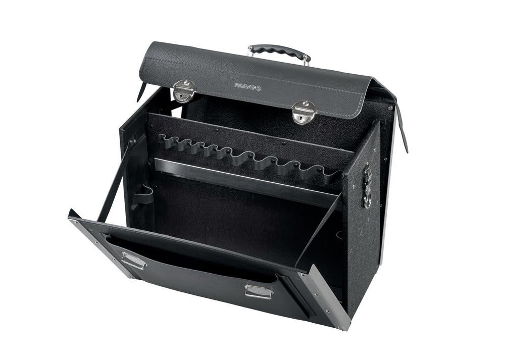 aus Rindsleder · schwarz · aluwinkelverstärkter Taschenkörper · Vorder- und Rückwand teilaufklappbar · mit 9 bzw. 11 festen Schlaufen · feste Mittelwand mit 19 festen Schlaufen · Seitenwände mit 4 Schlaufen · Halteschlaufe für Wasserwaage unter Griff · Vortasche · stabiler Griff · Bodenschale · abschließbare Parat-Steckschlösser · 2 Schließriemen · Ringkappen zur Befestigung eines Trageriemens (gehört nicht zum Lieferumfang)