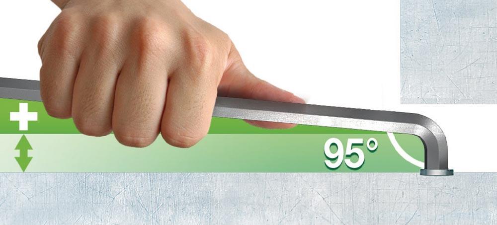 die 95°-Biegung des Schlüssels liefert ein optimales Verhältnis für platzsparendes Verschrauben bis zu doppeltem Arbeitsraum und schützt vor Verletzungen der Fingerknöchel
