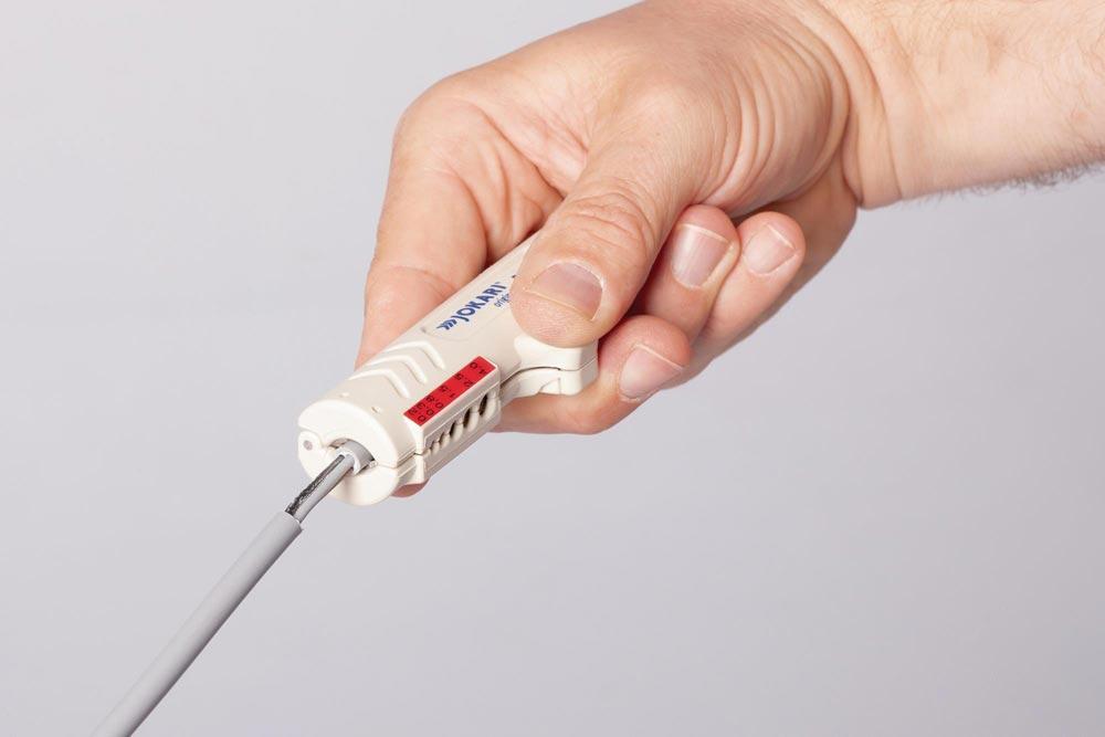 zum Abmanteln von Rundkabeln von 5 - 13 mm Ø · Abisolieren von verschiedenen Kabeltypen, z. B. IBM Typ 1, Typ 2, flexible Leitungen etc. · zum Abmanteln von PVC-isolierten Daten-, Kommunikations- und Steuerleitungen · Klingen Titan-Nitrid beschichtet, dadurch höhere Schnittgeschwindigkeit, geringerer Verschleiß, höhere Standzeit · keine Einstellung der Klingen auf die Schnitttiefe erforderlich · mit Abisoliervorrichtung für Leiter und Litzen von 0,2 - 4 mm² · Befestigungsclip zur sicheren Aufbewahrung · Gehäuse aus hochwertigem, verschleißfestem Polyamid · für Anwendungen in Handwerk und Industrie