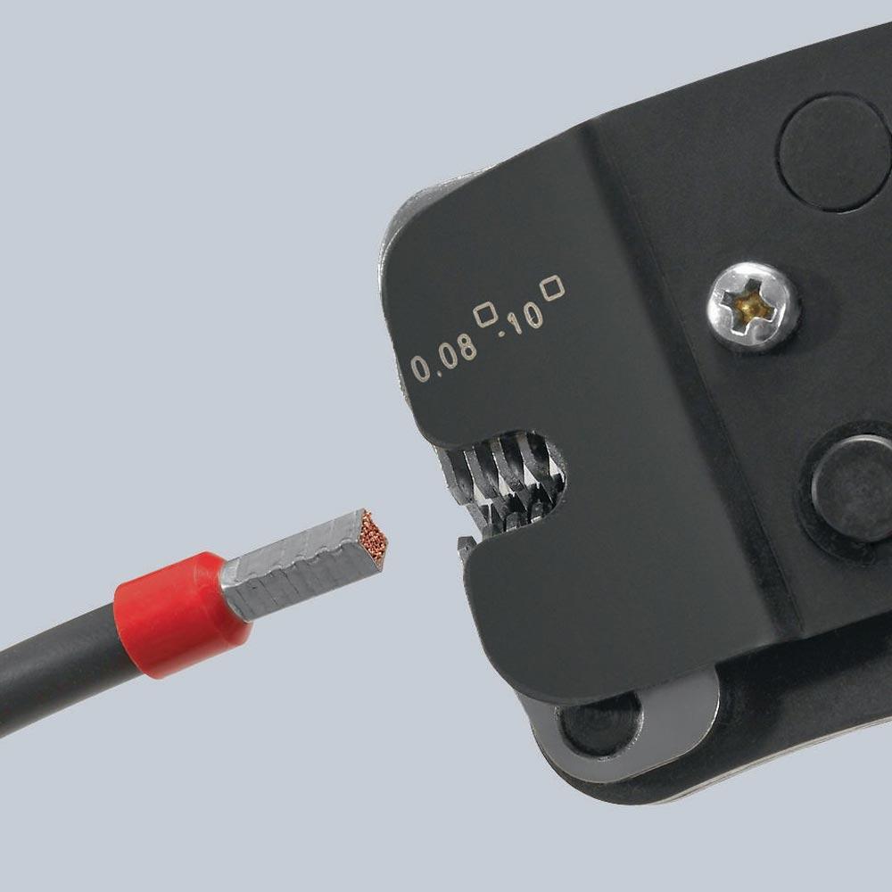selbsteinstellend · für Aderendhülsen · mit Fronteinführung · zum Verpressen von Aderendhülsen nach DIN 46228 (Teil 1 + 4) · Vierkantcrimpung für stets optimale Kontaktflächen ungeachtet der Positionierung im Klemmanschluss · handliche und leichte Ausführung · ermüdungsarmes Arbeiten durch hohe Übersetzung · Chrom-Vanadin-Elektrostahl in Sondergüte, ölgehärtet