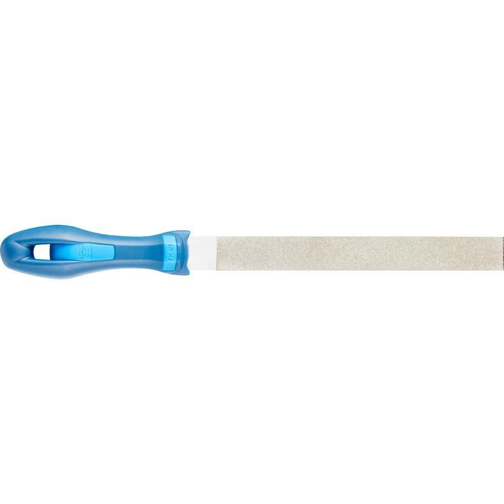 flachstumpf · mit Ergonomie-Feilenheft · Form A · Diamantfeilen werden überall dort eingesetzt, wo konventionelle Feilen aufgrund der Härte des zu bearbeitenden Werkstoffes versagen · auch für die Bearbeitung von gehärtetem Stahl · Die Arbeitstemperaturen sind so gering, dass kein chemischer Verschleiß auftritt · Somit kann die höhere Härte des Diamantkornes für eine längere Standzeit ausgenutzt werden.