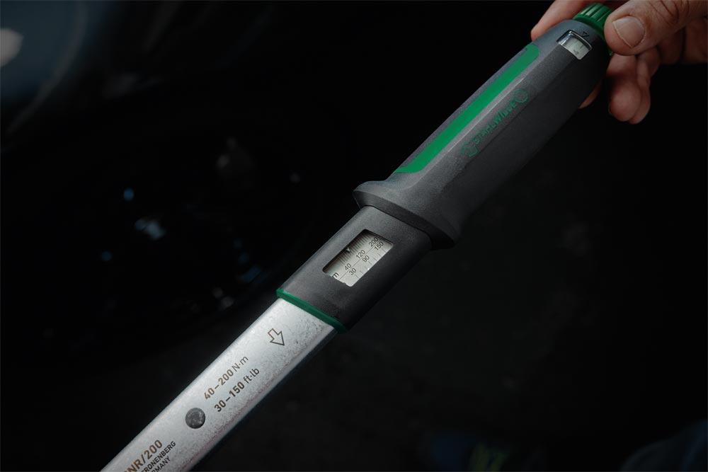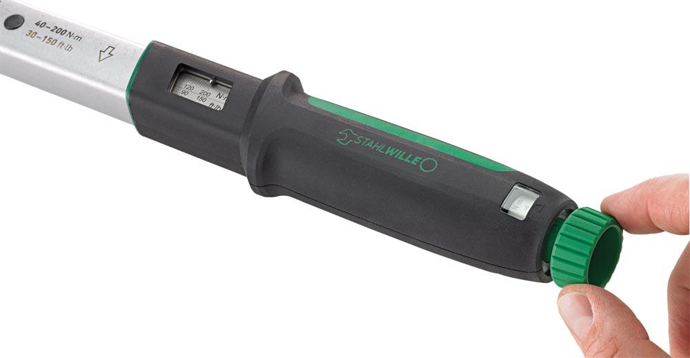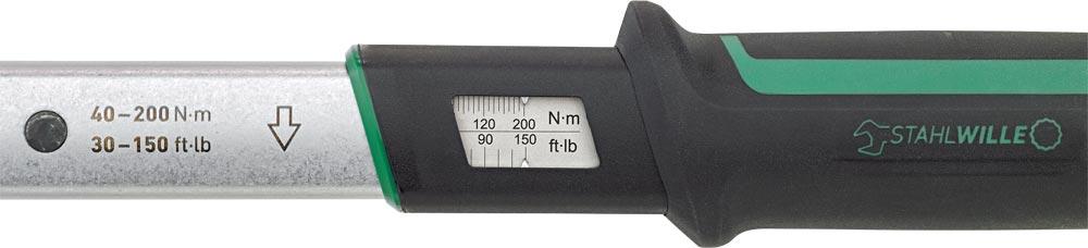 mit fest eingebauter Feinzahnknarre · für den kontrollierten Rechtsanzug · auslösend · schnelle Einstellung durch Schnellverstellung · Doppel-Stopp-Signal · sehr gut ablesbare Doppelskala mit farblicher Unterscheidung von Nm/ft·lb bzw. ft·lb/in·lb · 2-Komponentengriff (resistent gegen Öle, Fette, Kraftstoffe, Bremsflüssigkeiten und Skydrol) · nach Entlastung sofort wieder funktionsbereit ∙ Genauigkeit ± 4 % Toleranz von eingestelltem Wert