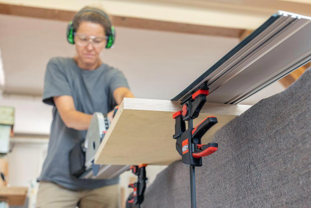 zum Fixieren von Führungsschienen der Marken Festool, Protool, Metabo, Makita, Hitachi/Hikoki, Dewalt etc. (Nutenabmessungen 12 x 6,5 mm bis 12 x 8 mm) sowie der Marken Bosch und Mafell dank aufschiebbarem Adapter (Nutenabmessungen 12 x 1,8 mm) · 2 St./VE
