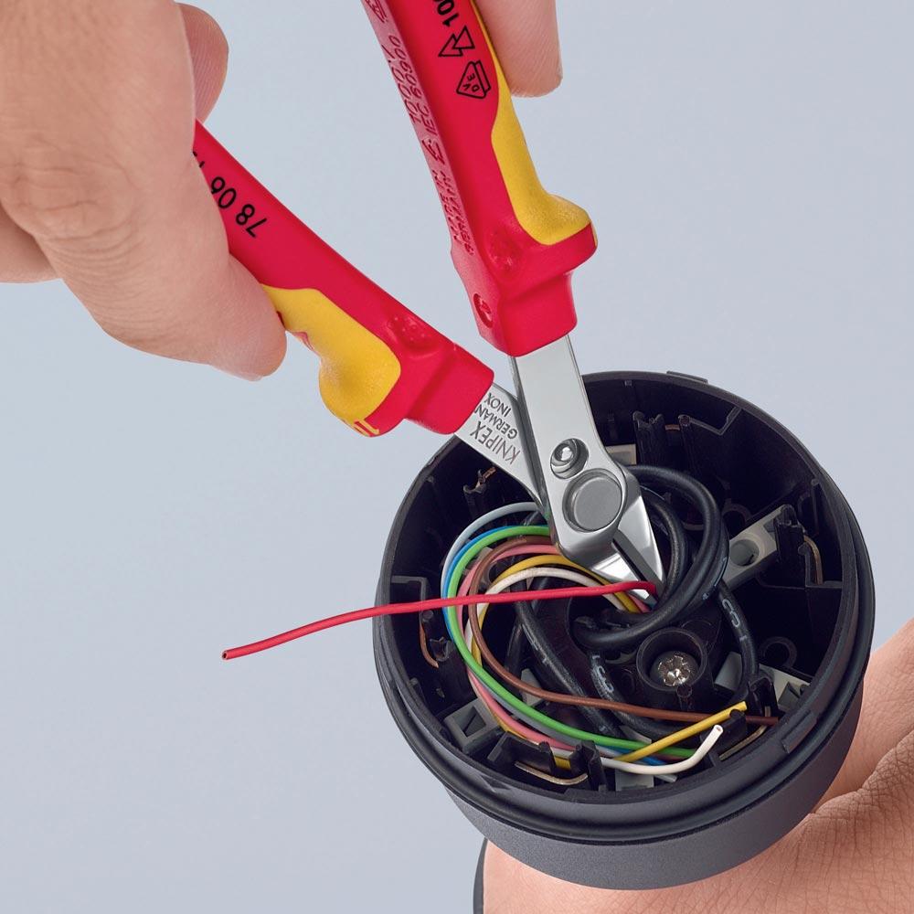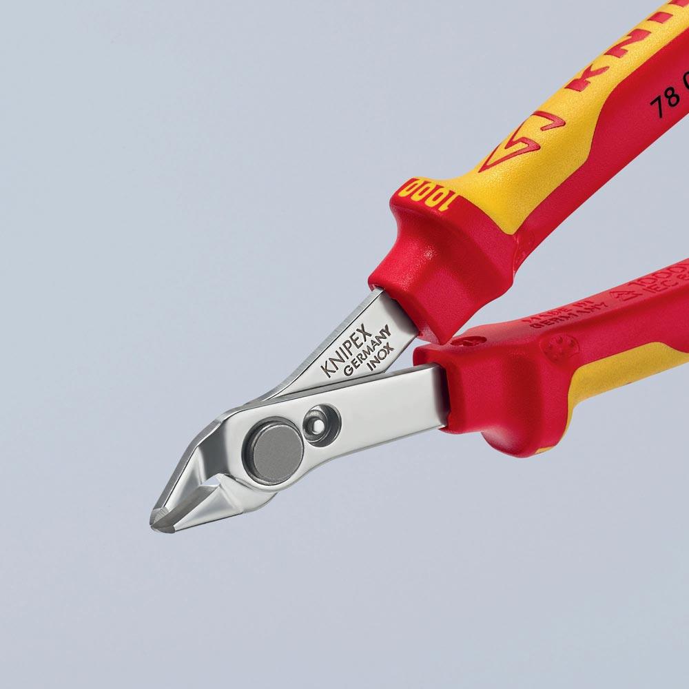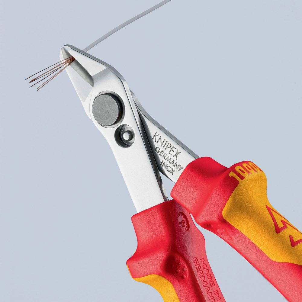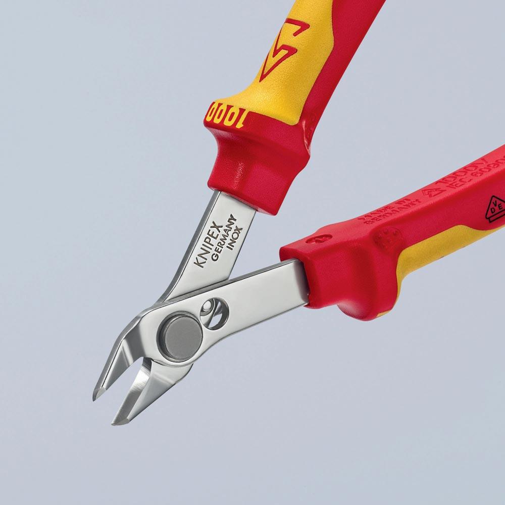 VDE-isoliert bis 1000 V · gefertigt gem. DIN EN/IEC 60900, stückgeprüft · für feinste Schneidarbeiten z. B. in Elektronik und Feinmechanik · geschliffene, sehr scharfe Schneiden · Gelenk mit Edelstahl-Niet · Schneiden zusätzlich induktiv gehärtet · mit Öffnungsfeder und Öffnungsbegrenzung · Inox