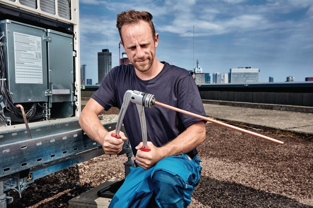 zum Aufweiten und Kalibrieren von weichen und halb- harten Rohren Ø 8 - 42 mm (5/16 - 1 3/4”) sowie zur Herstellung von Reduzierungen · Kosten für Fittings und Lagerhaltung entfallen · Umarbeiten von Rohrstücken zu Muffen · sichere Rohrverbindung nach DVGW · Robust, leicht und verschleißarm · exaktes Einstellen des Kapillarspalts · bis zu 50 % Einsparung der Kosten für Arbeitszeit, Lötmaterial, Lötstellen und Energie gegenüber Fittingverbindung · EPT-Technologie – innenliegender Kniehebel