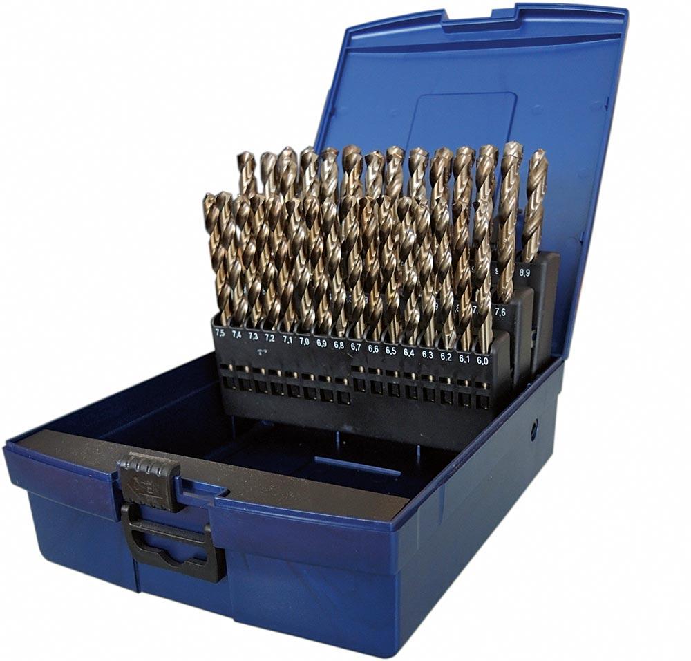 Ausführung: Mit Zylinderschaft, kurz, nach DIN 338 Typ N, rechtsschneidend ∙ Profilgeschliffener HSS-E/Co-Bohrer mit 5% Cobaltlegierung ∙ Hohe Rundlaufgenauigkeit, hohe Bruchsicherheit und lange Standzeit mit ausgeprägter Warmhärtebeständigkeit ∙ Gold-finish Ausführung ∙ Spitzenwinkel 130°, mit Kreuzschliff Form C ab Ø 2 mm - Ø-Toleranz h8 ∙ Übrige Konstruktionsmerkmale nach DIN 1414 ∙ Sätze in robuster Klappkassette aus ABS-Kunststoff