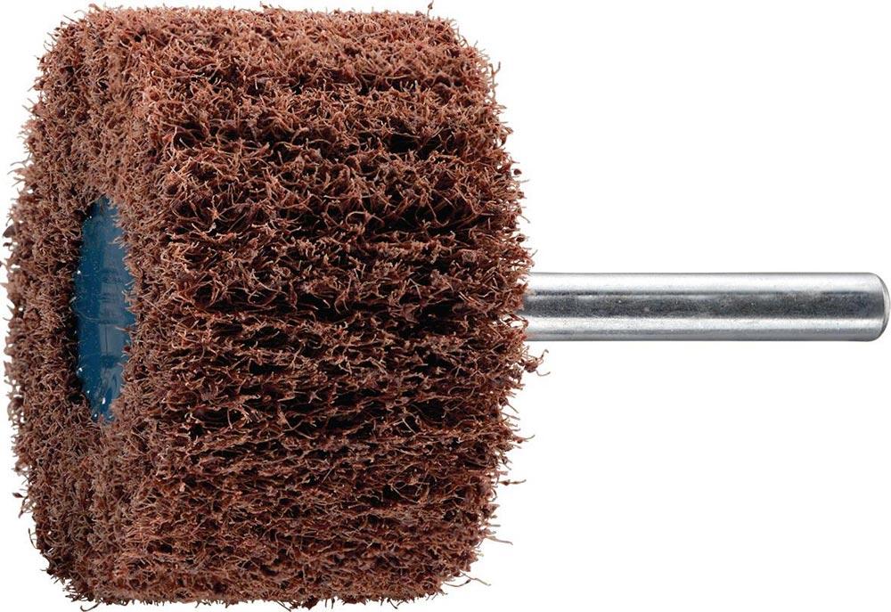 Korund A · Anordnung des Vliesmaterials radial in Lamellenform, wobei bei diesen Polierkörpern die Lamellen extrem dicht gepackt sind und dadurch eine hohe Standzeit erreicht wird · Schaft-Ø 6 mm