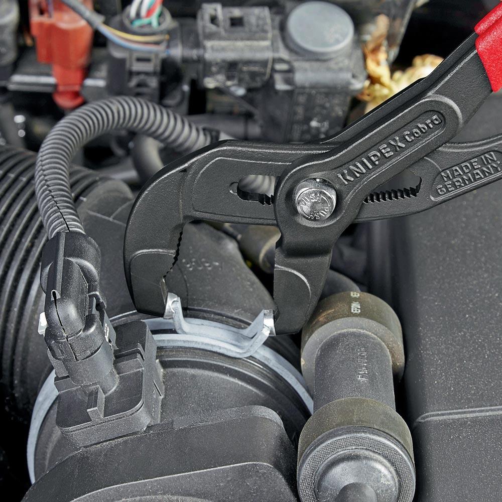 drehbare, universelle Greifeinsätze für den sicheren Griff der Schellen in jeder Position · extrem gute Hebelübersetzung mit der Schellen einfach, mit niedrigem Kraftaufwand leicht und sicher geöffnet werden · schlanker Kopf, geringe Kopfbreite · drehbare Greifeinsätze: ein ideales Werkzeug gerade unter beengten Verhältnissen · einsetzbar für Standard-, Raumspar- und Drahtschellen sowie Federbandringe bis zu 70 mm Nenngröße · 40 mm Spannweg · Chrom-Vanadin-Elektrostahl, geschmiedet, ölgehärtet