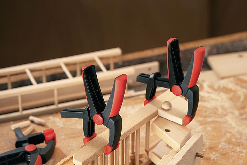mit stufenlos verstellbarer Spannweite · konstante Spannkraft bei jeder Spannweite · Druckstellen mit Softpads für schonendes Spannen · ergonomisch geformte 2-Komponenten-Griffe