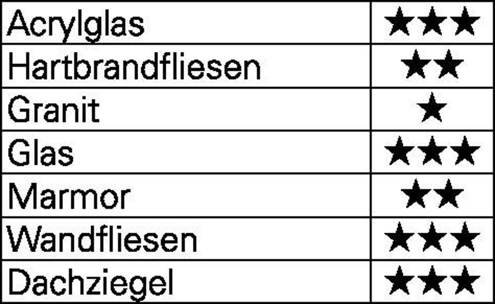 Anwendungsbereiche: Keramik, Fliesen, Hartbrandfliesen, Glas, Acrylglas, Spiegelglas