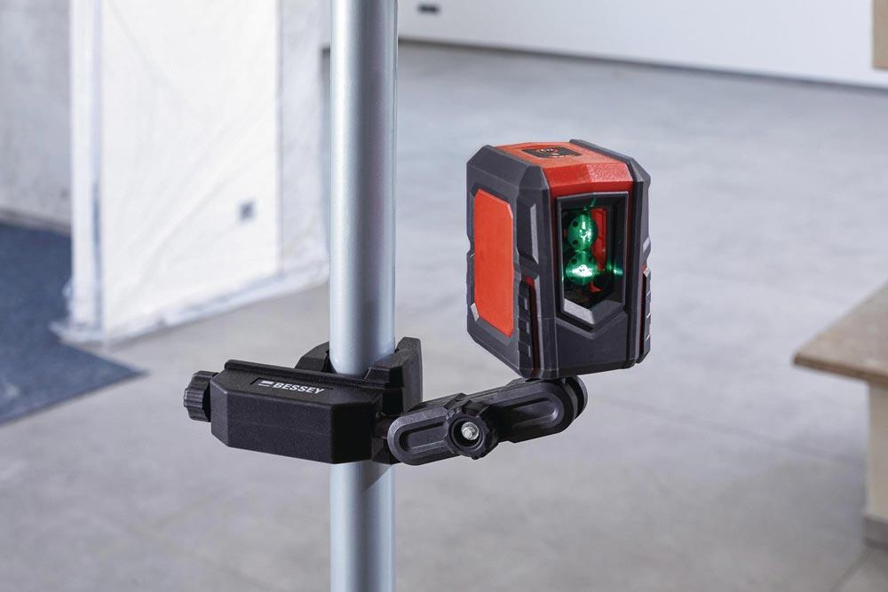Halterung mit 1/4″ Gewindeaufnahme zum Fixieren von Hilfsmitteln wie z.B. Laser · Kamera · Bauleuchte Werkzeuglos einsetzbar an runden (0-45 mm) sowie eckigen (0-55 mm) Trägerteilen wie z.B. Decken- und Montagestützen · Profilen · Leitern L-Drehhalterung mit zwei Rotationsachsen: 360° neben Befestigungsklemme · 180° an Gewindeaufnahme SB-verpackt