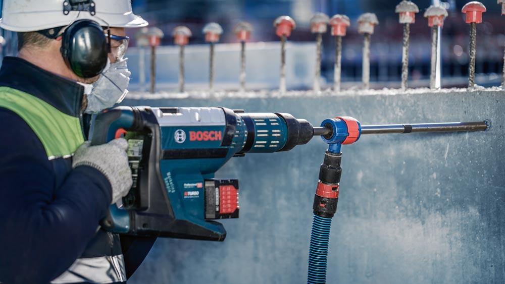 Bohren und Absaugen in einem Arbeitsgang ∙ Hammerbohrer mit 4-Schneiden-Hartmetallkopf und innenliegendem Absaugkanal ∙ Hochbeständige Bohrspitzenverbindung durch spezielles Schweißverfahren ∙ SDS Clean max Anschluss verbindet Bohrer mit Staubsauger ∙ Ideal bei Arbeiten Überkopf oder Dübel-/Ankerbefestigungen