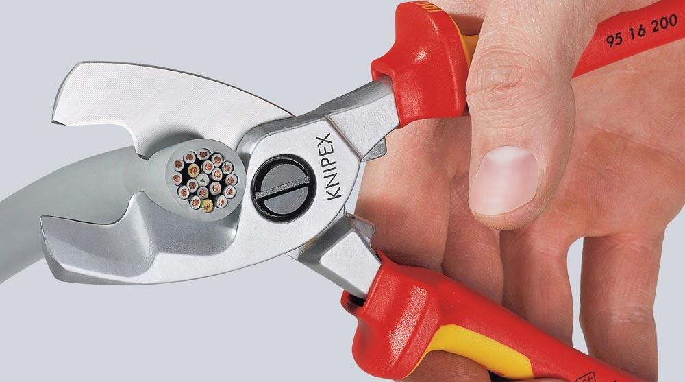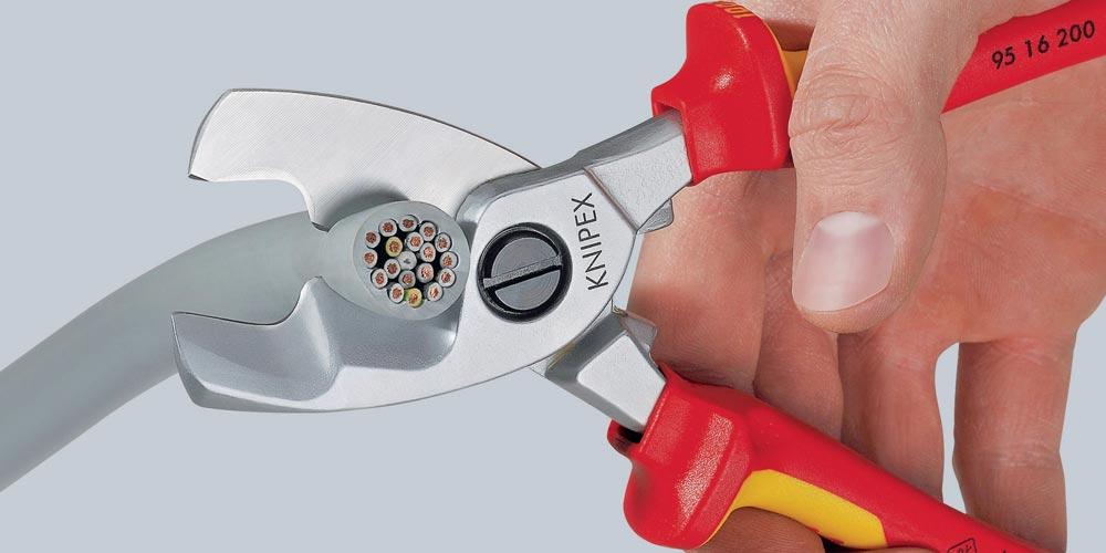 VDE-isoliert bis 1000 V · gefertigt gem. DIN EN/IEC 60900, stückgeprüft · mit Doppelschneide · für Kupfer-/Alukabel, ein- und mehrdrähtig · gehärtete Schneiden mit Präzisionsschliff · mit Vor- und Nachschnitt (1. und 2. Schneide) können Kabel bis 20 mm Ø in Einhandbetätigung getrennt werden · nicht für Stahldraht und hartgezogene Kupferleiter geeignet · Klemmschutz · Spezial-Werkzeugstahl in Sondergüte, geschmiedet, ölgehärtet