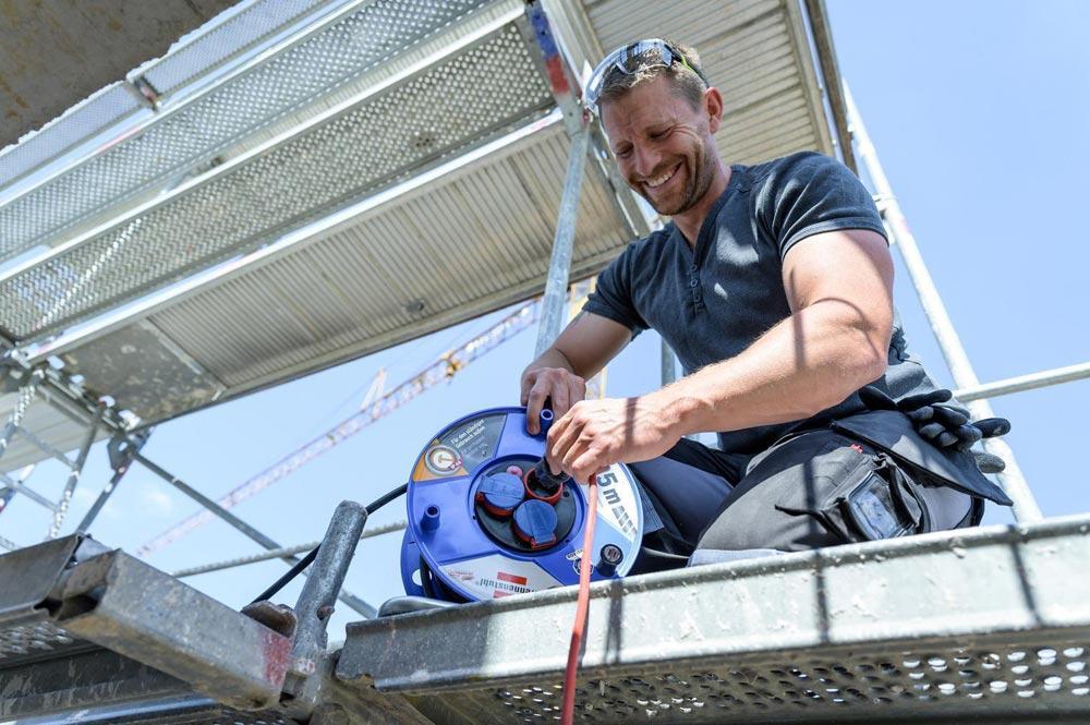 Die Garant IP44 Gewerbe-/Baustellen-Kabeltrommel mit 25m Kabellänge in der Farbe blau von Brennenstuhl überzeugt durch ihre Qualität und Sicherheit in allen Bereichen. Die Kabeltrommel eignet sich ideal für den Baustelleneinsatz und den Einsatz im Freien. Sie überzeugt außerdem durch folgende Eigenschaften: Innovativer Tragegriff ″cablepilot″ für die perfekte Kabelführung. Pendelt auf beiden Seiten und ermöglicht bequemes Tragen und Aufhängen RN-Kabel ist zugelassen für erschwerte Baubedingungen nach VDE 0100 Teil 704 Mit Drehgriff für komfortables Aufrollen Schutzart IP44 Kabellänge 25m Kabelbezeichnung H07RN-F 3G2,5 Kabelqualität Gummi-Neopren Kabelfarbe Schwarz Trommeldurchmesser 290 mm · Gummikabel H07RN-F