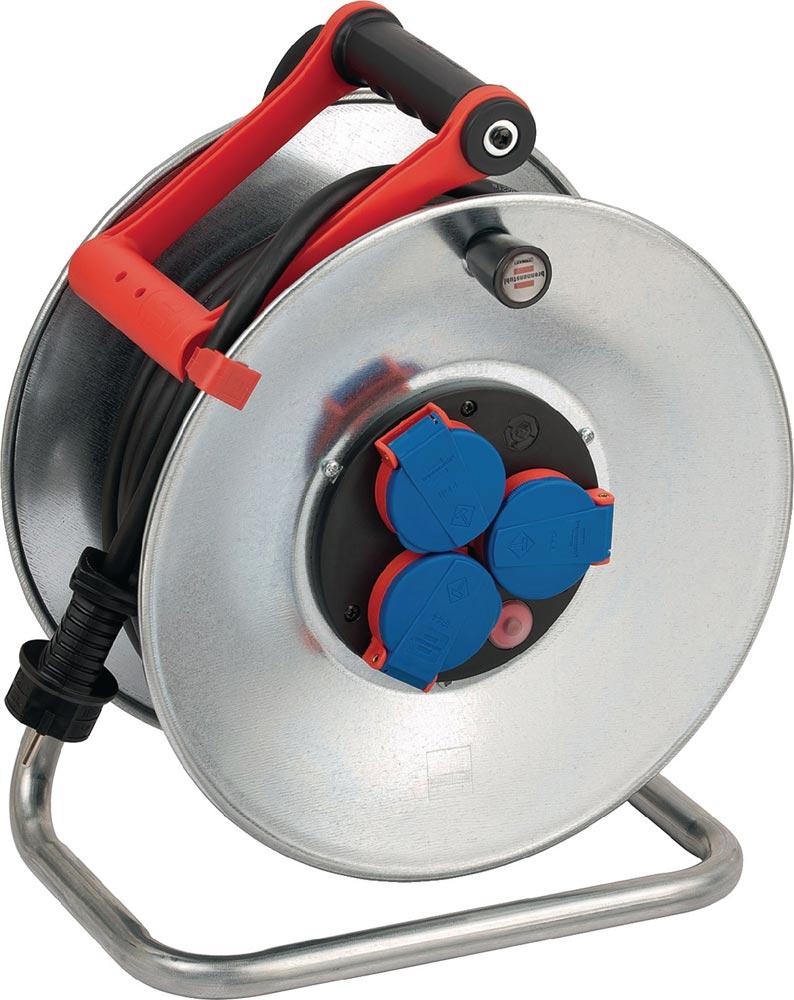 Trommelkörper aus rostgeschütztem, verzinktem Stahlblech Ø 290 mm · stabiles Tragegestell · innovativer Tragegriff "cablepilot" für perfekte Kabelführung · pendelt auf beiden Seiten und ermöglicht bequemes Tragen und Aufhängen · mit Drehgriff für komfortables Aufrollen · 3 spritzwassergeschützte Schutzkontakt-Steckdosen 230 V mit selbstschließenden Klappdeckeln · mit Überhitzungsschutz und Kontrollleuchte · Gummikabel H07RN-F