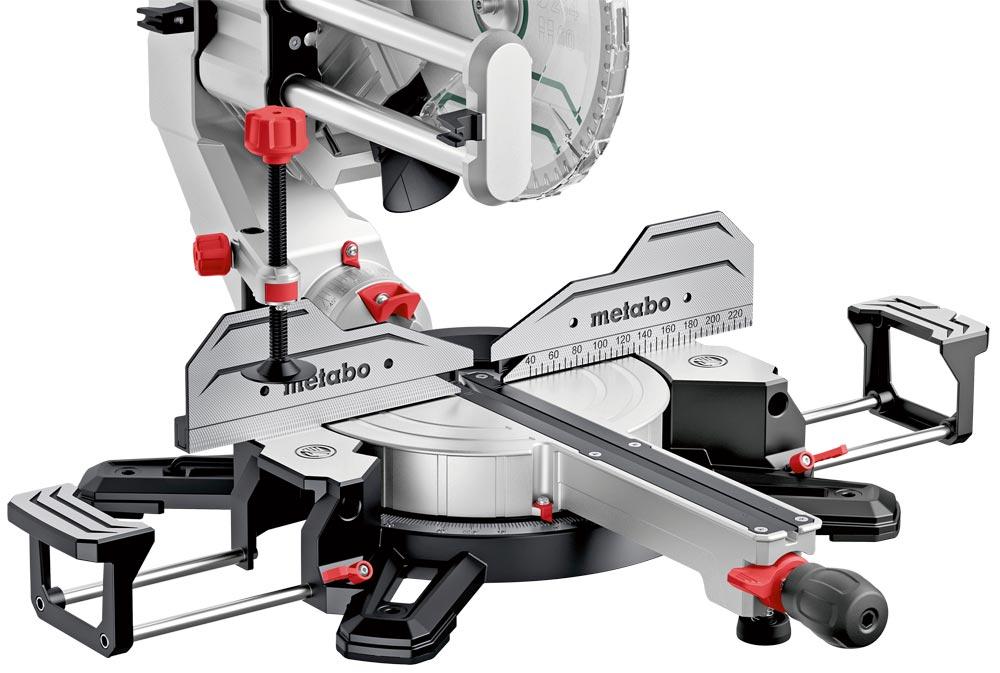 Säge ∙ Maximale Flexibilität beim Sägen durch beidseitig drehbaren Tisch und beidseitig neigbaren Sägekopf ∙ Variable Drehzahl für erweitertes Einsatzspektrum, z.B. zum Sägen von Alu-Profilen und Kunststoffen ∙ Effektive Spanabsaugung über integrierten Spänefangtrichter ∙ Sanftanlauf für lange Lebensdauer von Motor und Getriebe ∙ Schnelle und präzise Einstellung gängiger Winkel über Rastpunkte ∙ Ausziehbare Tischverbreiterungen, auch abnehmbar zum Unterlegen extrem langer Werkstücke ∙ Schnellspannzwinge zur sicheren Fixierung des Werkstücks von oben oder von vorne ∙ Tiefenanschlag zur einfachen Herstellung von Nuten
