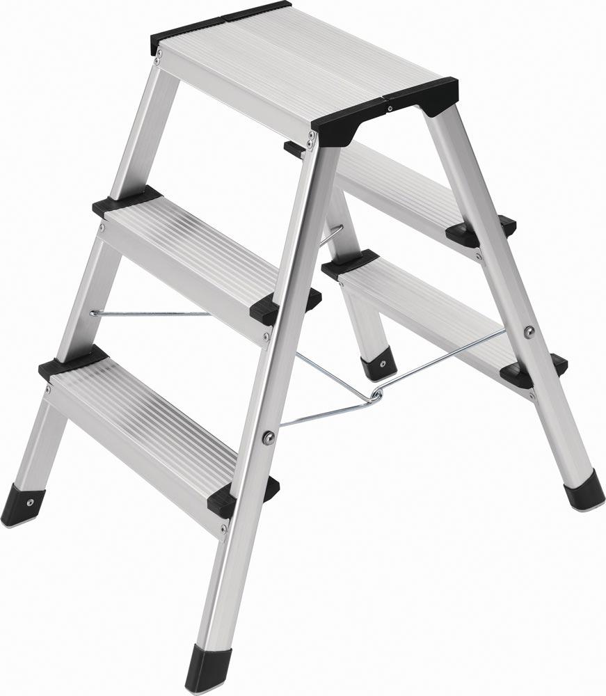 Aluminium · leicht und handlich · platzsparend, zusammenklappbar · Stufen mit Anti-Rutsch-Riffelung · Holme eloxiert · Sicherheitsverriegelung · 2-Komponenten-Kunststofffuß für sicheren Stand auf verschiedenen Böden · max. Gesamtbelastung 150 kg