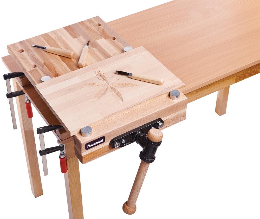 Mobile Kompakt-Hobelbank für den variablen Einsatz ∙ Schnelle und einfache Montage an jedem Tisch durch Klemmung der Standfüße ∙ Massive, keilgezinkte Buchenholz-Arbeitsplatte ∙ Präzise Vorderzange mit doppelten Führungsstangen ∙ 19 mm Lochsystem für vielseitige Spannmöglichkeiten