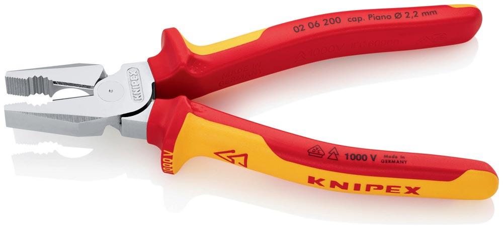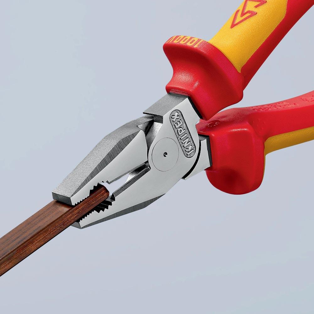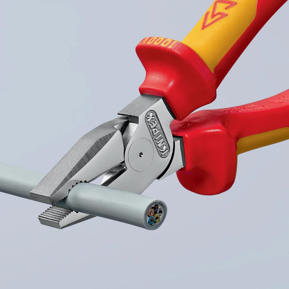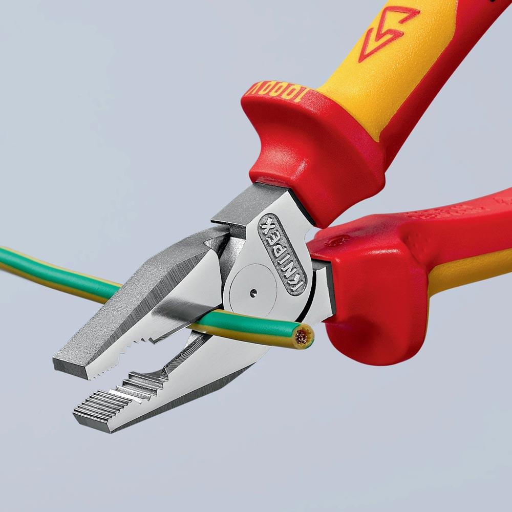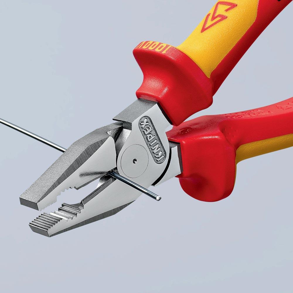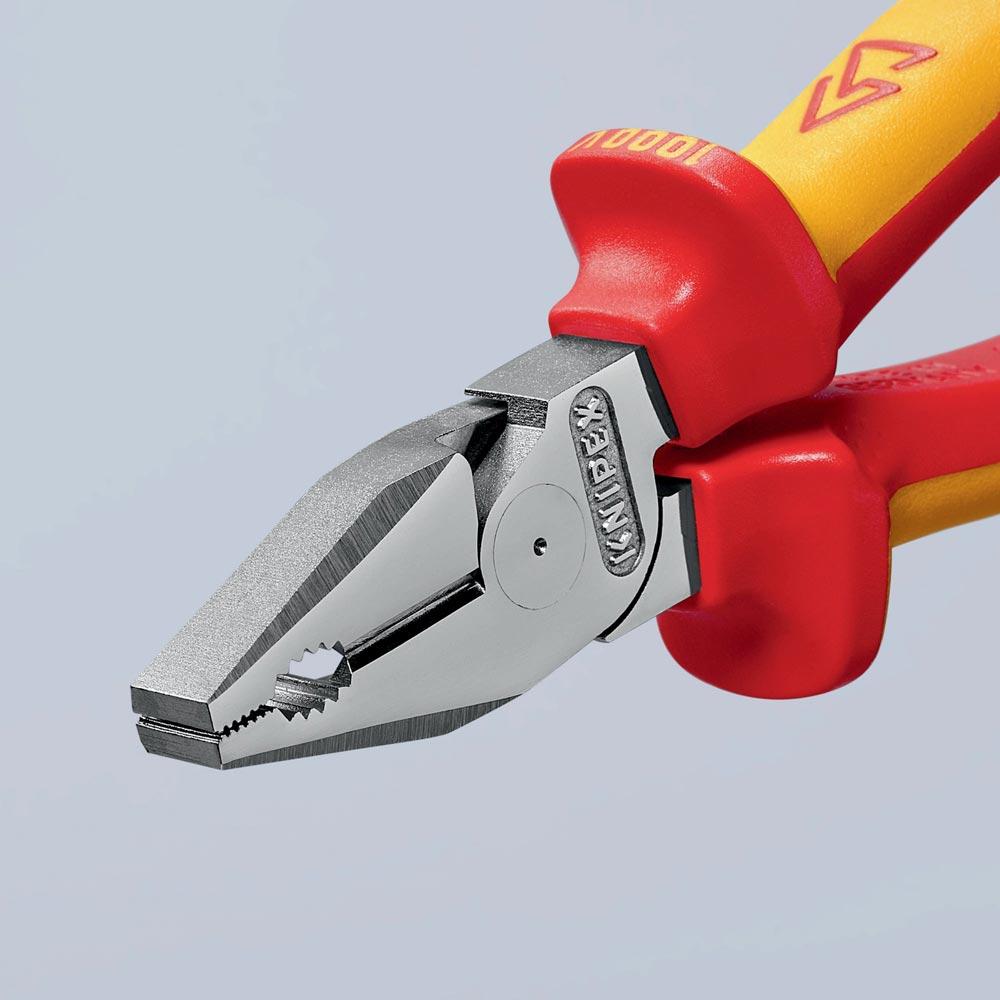 VDE-isoliert bis 1000 V · gefertigt gem. DIN EN/IEC 60900, stückgeprüft · 35 % Kraftersparnis gegenüber herkömmlichen Kombizangen · Greifzonen für Flach- und Rundmaterial · lange Schneiden für dickere Kabel · Schneiden zusätzlich gehärtet, Schneidenhärte ca. 63 HRC · Spezial-Werkzeugstahl in Sondergüte, geschmiedet, mehrstufig ölgehärtet