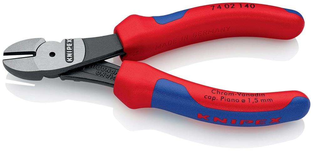 20 % Kraftersparnis gegenüber herkömmlichen Seitenschneider · Schneiden zusätzlich induktiv gehärtet, Schneidenhärte ca. 64 HRC · Chrom-Vanadin-Hochleistungsstahl, geschmiedet, mehrstufig ölgehärtet