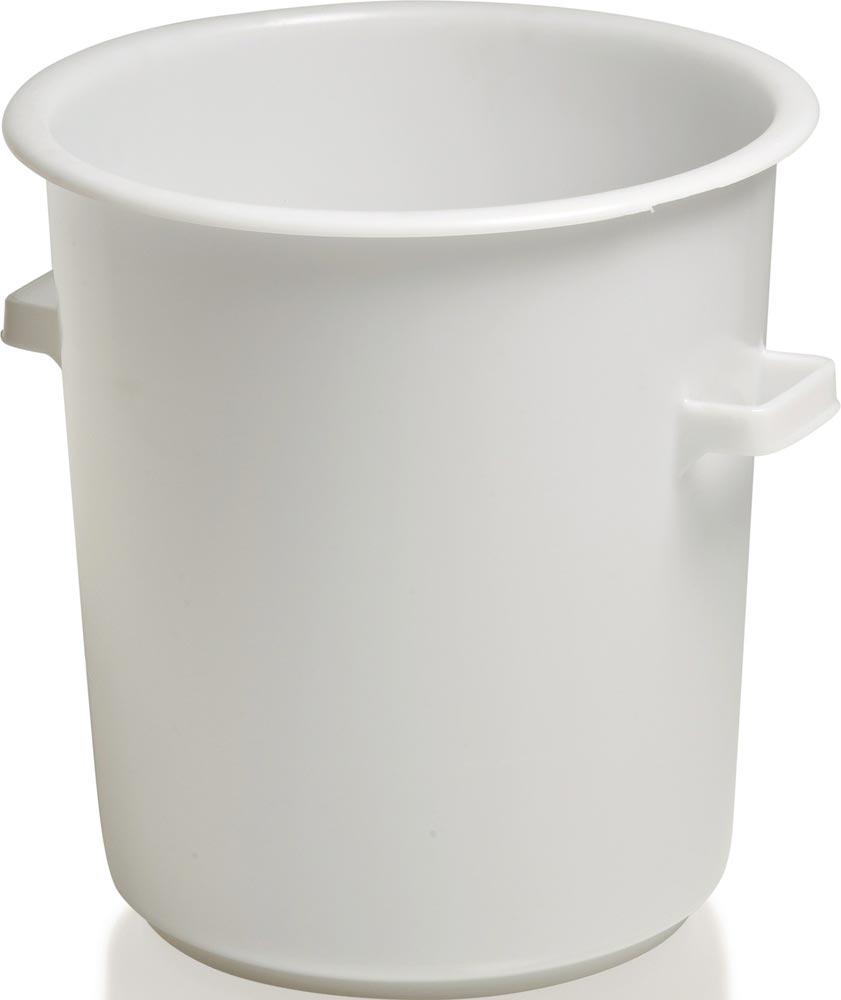 HD-Polyethylen · rund · mit 2 Außengriffen · leer ineinander stapelbar · mittels Spezialdeckel auch aufeinander stapelbar · die Behälter sind formstabil, leicht zu reinigen und auch bei tiefsten Temperaturen bruchfest · temperaturbeständig von -30 °C bis +40 °C (kurzfristig bis +90 °C) · lebensmittelecht · Farbe weiß