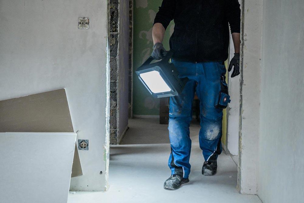 kompatibel mit verschiedenen 18V Akkus (verschiedene Ah Klassen) der Powertool-Hersteller Bosch Professional, Makita, Dewalt, Milwaukee, Metabo CAS · mehr Flexibilität durch Hybridtechnik: Akku- und Netzbetrieb möglich, automatische Umschaltung von Netz auf Akku bei Stromausfall · Plug-In-Kabelanschluss · Schalter mit Funktion: 100% - 75% - 50% - 25% Licht · Leuchtdauer in Abhängigkeit des verwendeten Akkus, ca. 12 min/1 Ah bei 100 % Lichtleistung · Akku-Zustandsanzeige · Akkus sind vor Tiefenentladung und Überhitzung geschützt · abnehmbare Akku Schutzhaube · LED Strahler mit Kippschutz, schützt Linse und Gehäuse des Strahlers · standfestes Gehäuse · ergonomischer Griff · Ein/Aus Schalter · Stativmontage möglich · Einsatz für den rauen Betrieb