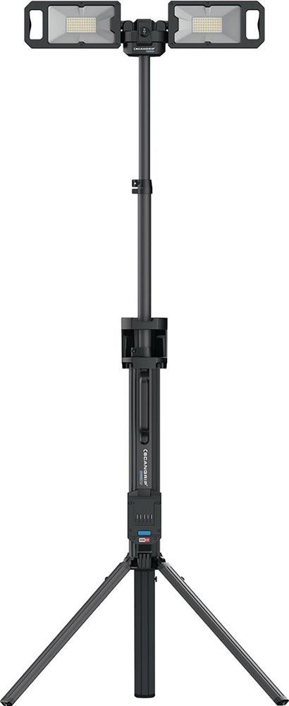 Baustrahler mit 5000 Lumen und integriertem Stativ für 18-V-Akkupacks · zwei eingebaute Flutlichtstrahler · um 360° drehbar · SCHNELLFALTSYSTEM · Gewicht 5,2 kg