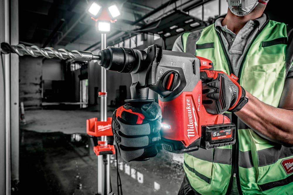 Leistungsstarker Akku-Kombihammer mit bürstenlosen POWERSTATE™ Motor ∙ Patentierter AUTOSTOP™ als Sicherheitsmechanismus ∙ REDLINK PLUS™ Elektronik ∙ FIXTEC™-Werkzeugschnellwechselsystem ∙ Robustes Metallgetriebegehäuse ∙ 4 Betriebsarten: Bohren, Hammerbohren, Meißeln und wählbare Arbeitsposition des Meißels (Variolock) für maximale Vielseitigkeit