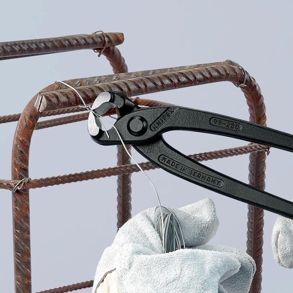 (Rabitz- oder Flechterzange) · zum Verdrillen und Schneiden von Bindedraht von der Rolle in einem Arbeitsgang · Schneiden zusätzlich gehärtet, Schneidenhärte ca. 61 HRC · Spezial-Werkzeugstahl in Sondergüte, geschmiedet, mehrstufig ölgehärtet