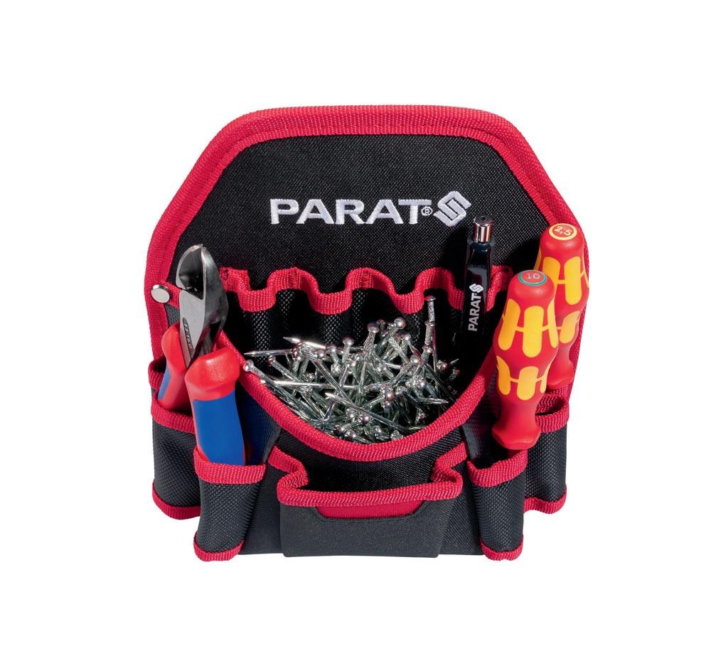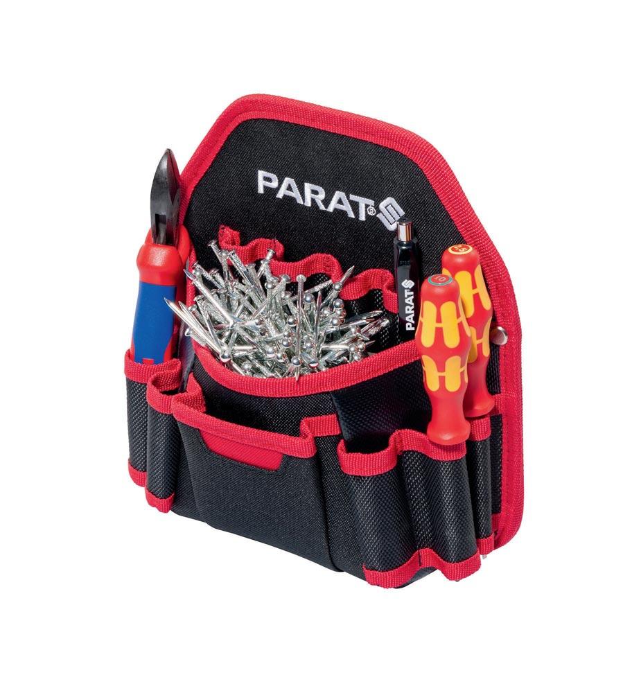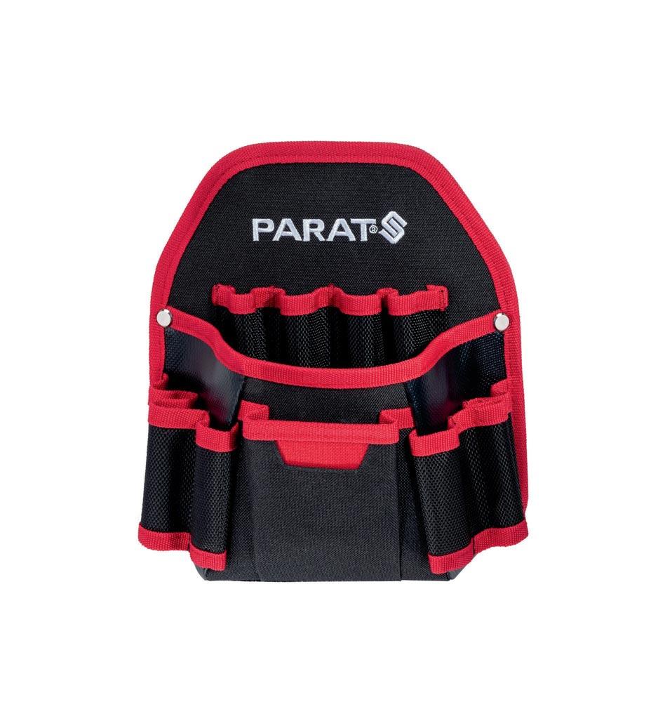 aus strapazierfähigem Nylon · schwarz/rot · großes Hauptfach mit vier Einsteckfächern · Clip zur Befestigung am Gürtel · zusätzlich 6 äußere Einsteckschlaufen und ein kleines Einsteckfach