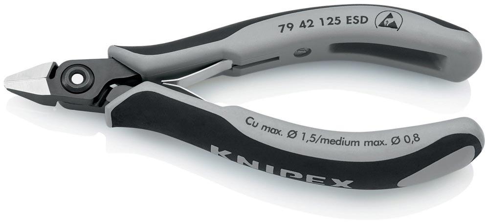 ESD · für feinste Schneidarbeiten z. B. in Elektronik und Feinmechanik · geschliffene, scharfe Schneiden · Schneiden zusätzlich induktiv gehärtet, Schneidenhärte ca. min. 64 HRC · ca. 20% weniger Gewicht · geschraubtes Gelenk · Öffnungsfeder · Chrom-Vanadin-Kugellagerstahl, geschmiedet, mehrstufig ölgehärtet · elektrisch ableitend - dissipativ