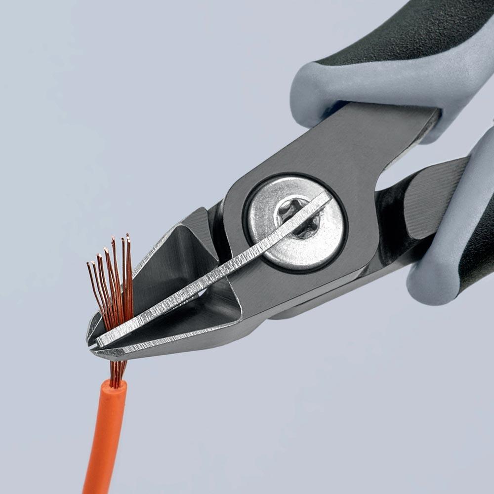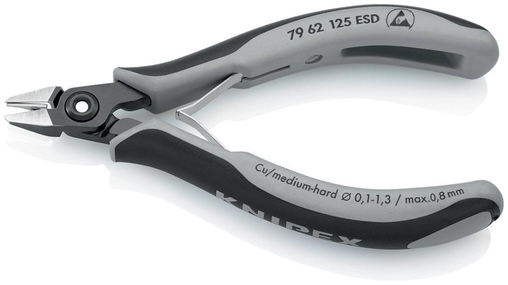 ESD · für feinste Schneidarbeiten z. B. in Elektronik und Feinmechanik · geschliffene, scharfe Schneiden · Schneiden zusätzlich induktiv gehärtet, Schneidenhärte ca. min. 64 HRC · ca. 20% weniger Gewicht · geschraubtes Gelenk · Öffnungsfeder · Chrom-Vanadin-Kugellagerstahl, geschmiedet, mehrstufig ölgehärtet · elektrisch ableitend - dissipativ