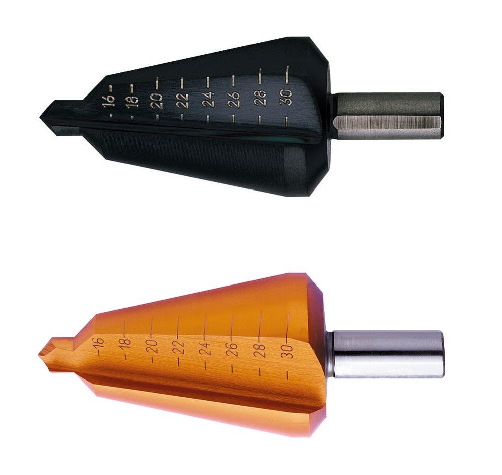 Anwendung: Zum gratfreien Bohren und Aufreiben von Blechen, Rohren, Profilen aus Stahl, NE-Metallen, Kunststoffen etc. ∙ HSS-TiN besonders geeignet für rost- u. säurebeständige Stähle (VA)