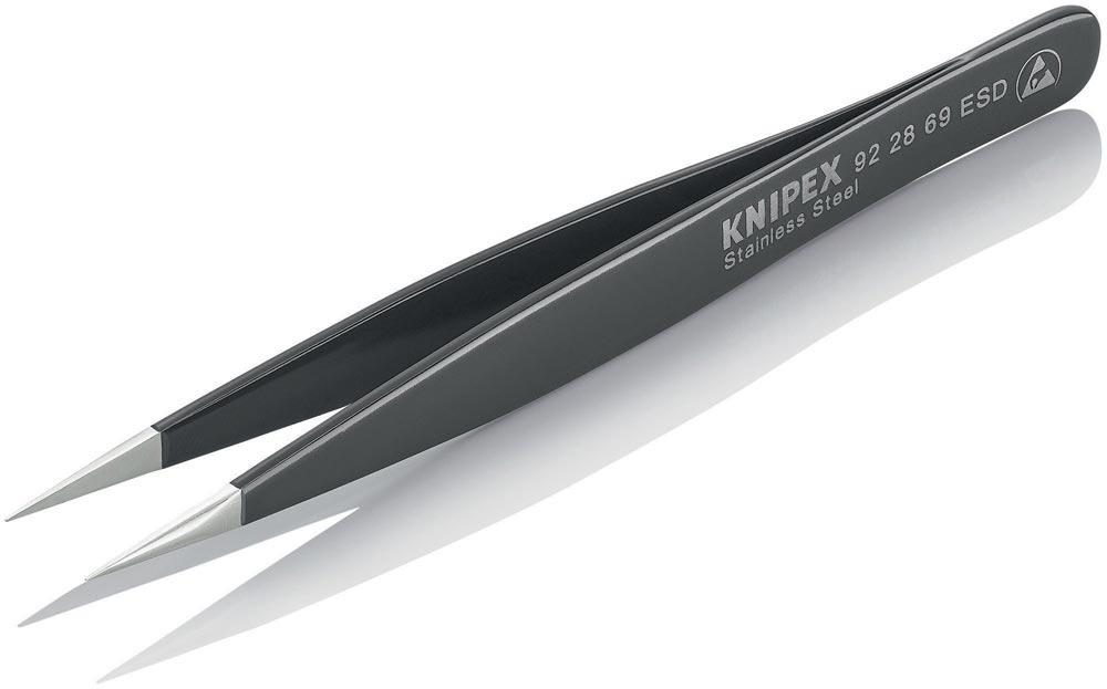 ESD-Beschichtung: blendfrei schwarz, mit einem Oberflächenwiderstand von ca. 105 Ohm · Spitzen blendfrei gebürstet · Greifflächen mattiert für optimalen Halt · Chrom-Nickel-Stahl, rostfrei, antimagnetisch (18/10)