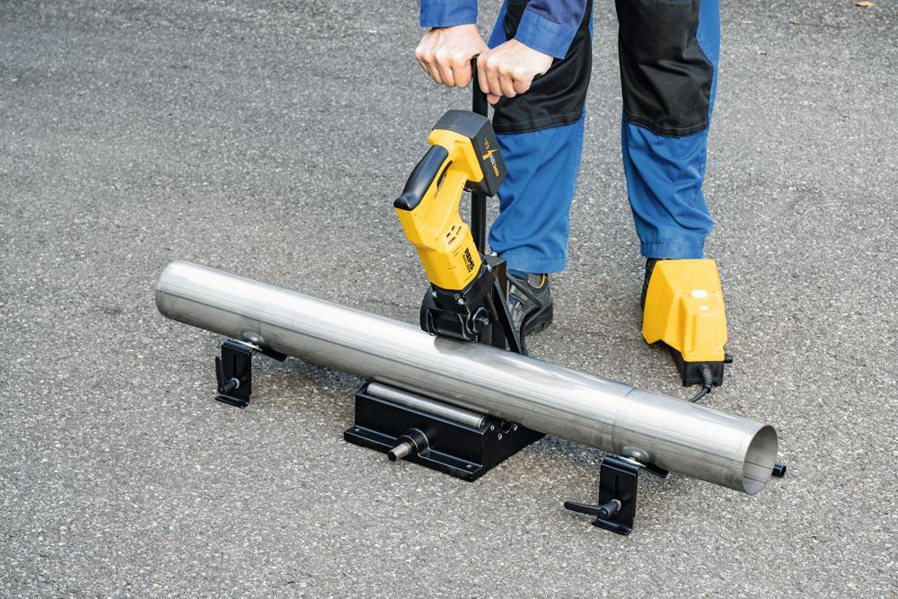 Anwendung: Zum schnellen, rechtwinkeligen Trennen von Edelstahl-, Kupfer- und C-Stahlrohren, Stahlrohre DIN/EN 2440/10255 NW 50-100, Gussrohre DIN/EN 19522/877 NW 50-100, Kunststoffrohre ≤ 10 mm Wanddicke Ø 10-110 mm und Verbundrohre Ø 10-110 mm der Pressfittings-Systeme ohne Auengrat ∙ Für den Einsatz in der Werkstatt, Industrie, Handwerk und auf Baustellen