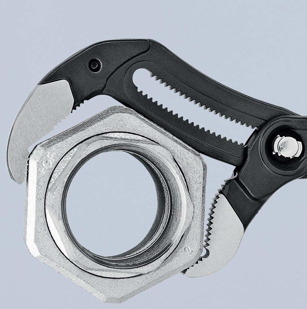 selbstklemmend an Rohren und Muttern · durchgestecktes Gelenk für hohe Stabilität durch doppelte Führung · Einstellung per Knopfdruck direkt am Werkstück · Greifflächen mit spezialgehärteten Zähnen, Härte der Zähne ca. 61 HRC · Klemmschutz · Chrom-Vanadin-Elektrostahl, geschmiedet, mehrstufig ölgehärtet