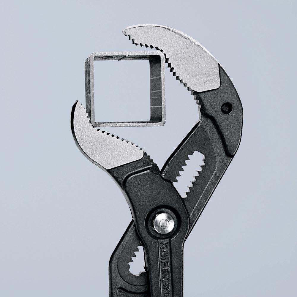 selbstklemmend an Rohren und Muttern · durchgestecktes Gelenk für hohe Stabilität durch doppelte Führung · Einstellung per Knopfdruck direkt am Werkstück · Greifflächen mit spezialgehärteten Zähnen, Härte der Zähne ca. 61 HRC · Klemmschutz · Chrom-Vanadin-Elektrostahl, geschmiedet, mehrstufig ölgehärtet