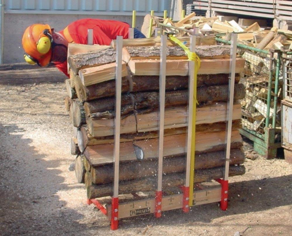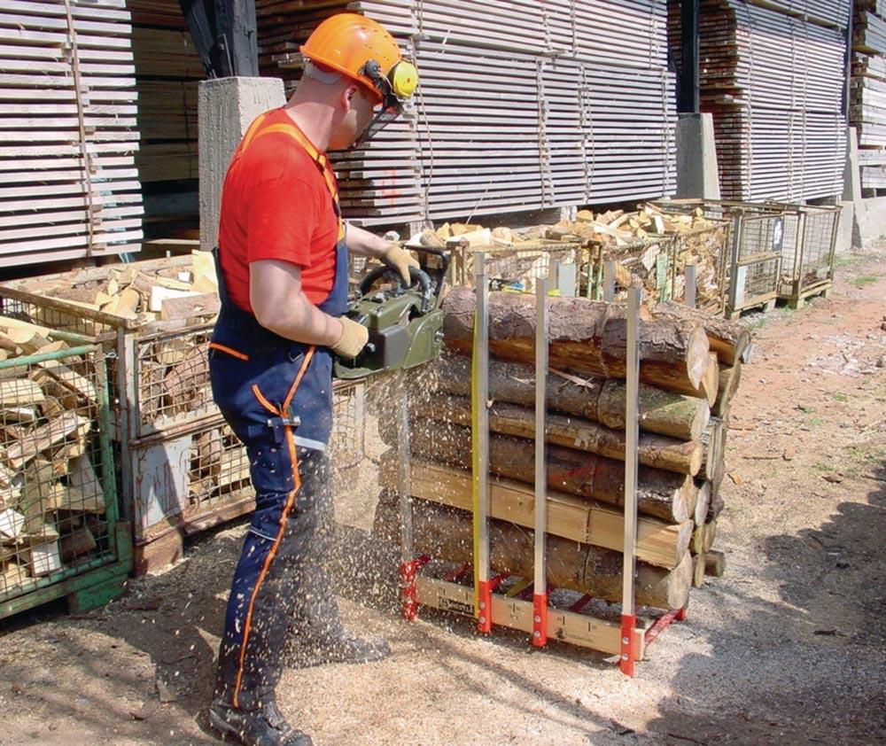 ofenfertige Scheite von 25, 33 oder 50 cm sicher sägen · kann mit wenigen Handgriffen so zerlegt werden, dass er in jedem Kofferraum mitgeführt werden kann · Aufnahme Raummeter 0,33 Ster · steckbare Rungenstangen aus Aluminium · mitgeliefertes Ratschenband zur Sicherung der Beladung des Sägebocks