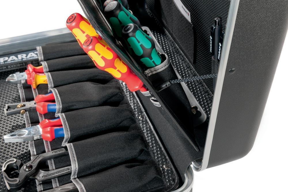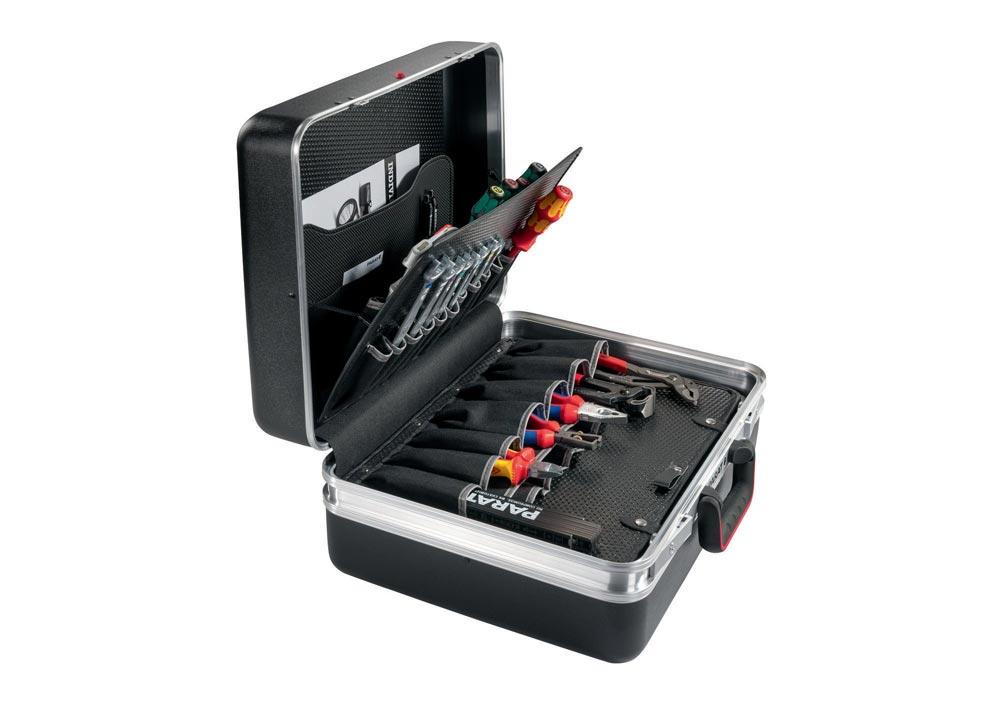 Kofferschalen aus schlagfestem X-ABS-Kunststoff · schwarz · extrem schlagzäh · Doppel-Aluminiumrahmen · gepolsterte Griffmulden · abschließbare Kippzylinderschlösser · Rastscharniere mit Arretierung · Bodengleiter · Tragfähigkeit bis 30 kg · Ausstattung: 1 Werkzeugtafel mit 25 Einsteckfächern, 1 Klemmfach 400 mm · 1 Abdeckplatte mit 15 Einsteckfächern, 1 Klemmfach 400 mm · 1 Bodenschale, Höhe 88 mm, frei unterteilbar, Dokumentenfach im Deckel