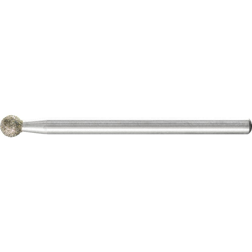 Kugelform · galvanisch gebundenes Diamantwerkzeug · zum Gravieren, Schleifen von Konturen und Entgraten geeignet · zur Bearbeitung von Hartmetall, Glas, Keramik, Porzellan, feuerfesten Werkstoffen, Ferrit, Silicium, Graphit, Gummi usw. · die Kugelform wird häufig im handgeführten Einsatz genutzt · empfohlene Umfangsgeschwindigkeit Vc =