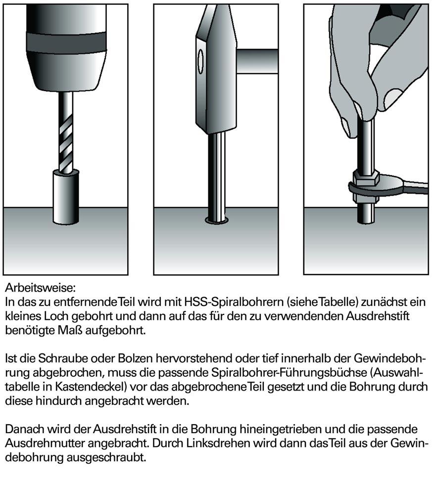 zum Ausdrehen abgebrochener Schrauben und Bolzen · komplett mit Schraubenausdrehern, HSS-Spiralbohrern und Bohrer-Führungsbüchsen für das problemlose Anbohren auch tief in Gewindelöchern abgebrochener Teile · Inhalt: