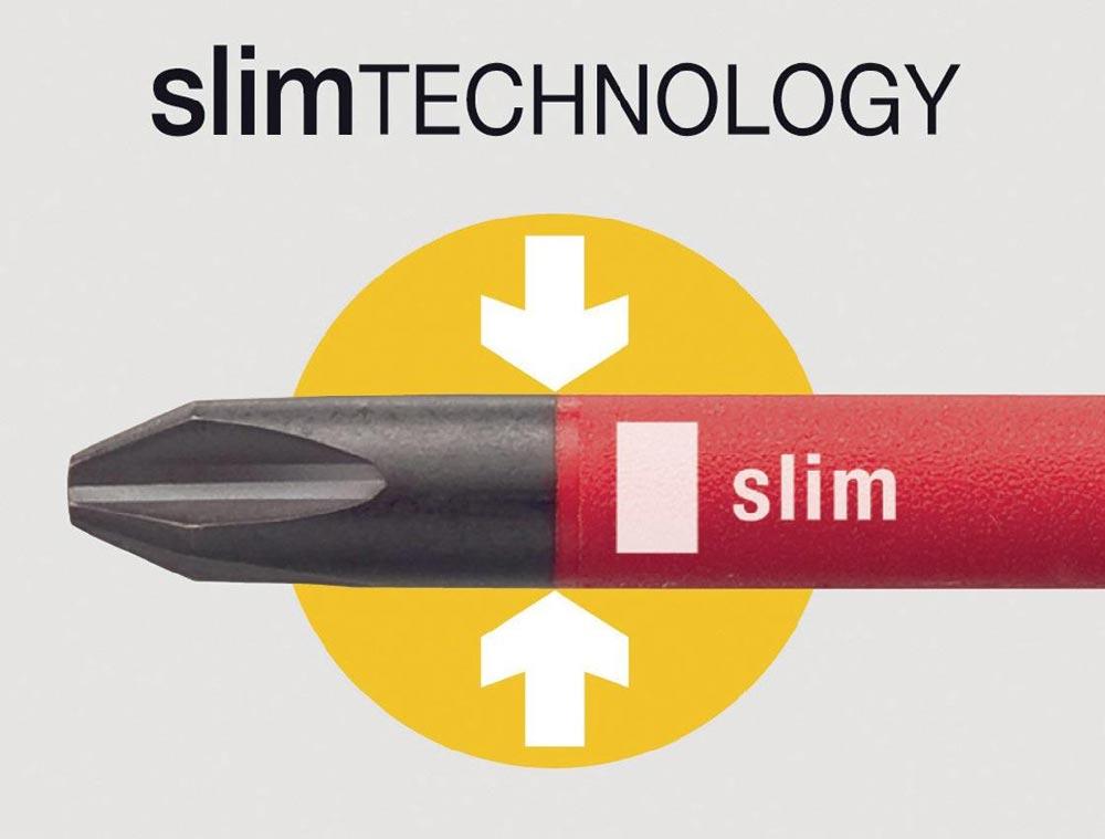 Durch die im vorderen Bereich vollständig in die Klingen integrierte Schutzisolation können auch tiefliegende Schrauben gut erreicht werden (T 8 u. T 9 = keine slimFix Ausführung)