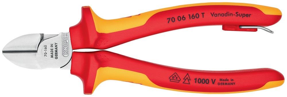 VDE-isoliert bis 1000 V · gefertigt gem. DIN EN/IEC 60900, stückgeprüft · schlanke Kopfform · sauberer Schnitt bei dünnen Cu-Drähten, auch an den Schneidenspitzen · Schneiden zusätzlich gehärtet, Schneidenhärte ca. 62 HRC · Vanadin-Elektrostahl, geschmiedet, mehrstufig ölgehärtet