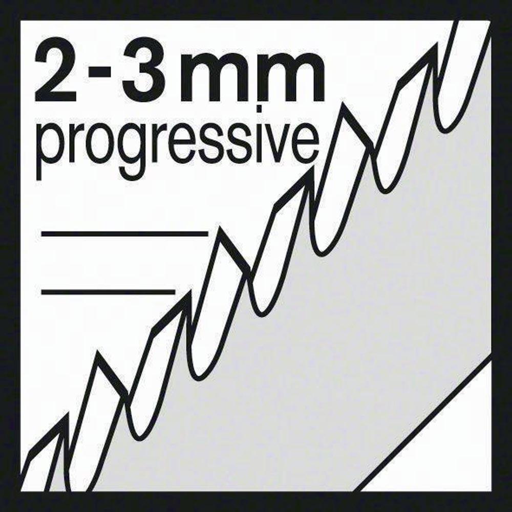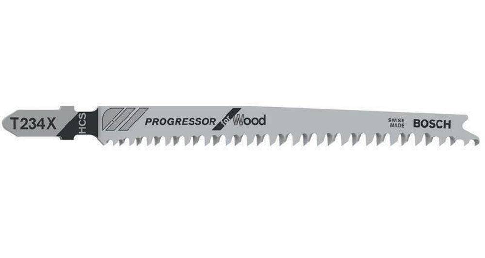 Stichsägeblatt T 234 X Progressor for Wood. Das T 234 X Progressor for Wood Stichsägeblatt für den Gebrauch bei dickem oder dünnem Holz macht saubere gerade Schnitte. Die Zahngeometrie mit progressiv ansteigender Zahnteilung ermöglicht den Gebrauch bei Materialien mit unterschiedlichen Dichten. Die Kombination des Kegelschliffkörpers · der präzisionsgeschliffenen Zähne und der mehrfach geschliffenen japanischen Zahngeometrie ermöglicht sauberes Schneiden. Das Blatt aus Kohlenstoffstahl ist zum Schneiden von Weichholz und nicht-abrasiven Holzwerkstoffen geeignet. Es ist mit einer mittleren progressiven Zahnteilung (2 bis 3 mm) und einer großen Länge (117 mm) ausgestattet · um eine breite Vielzahl an Holzwerkstoffen mit einer Dicke von 3 bis 65 mm zu schneiden. Für den Gebrauch mit Stichsägen mit T-Schaft-Aufnahme. Einnockenschaft. Schnell · sauber durch dick und dünn. Einsatzbereiche: Für Weichholz von 3 bis 65 mm Stärke · für Span- · Tischler- · Faserplatten. Inhalt der Verkaufspackung: 25 Stück.