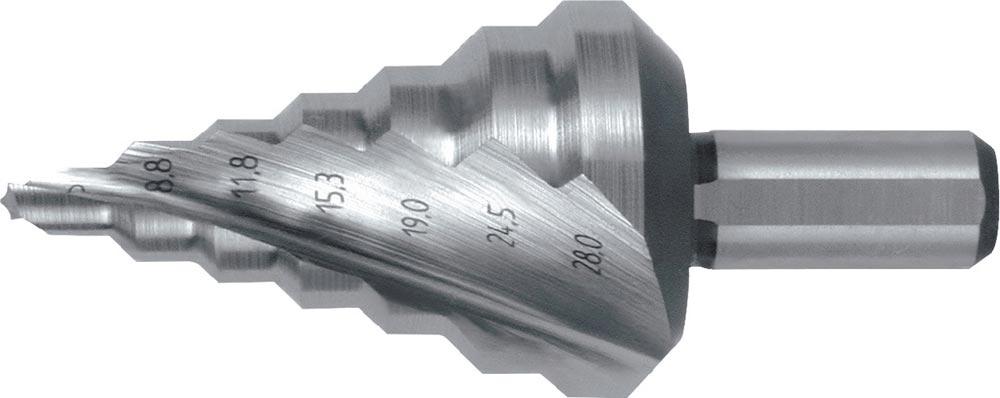 Produktinformationen "Stufenbohrer Bohrbereich 5-28 mm HSS spiralgenutet Schneidenanzahl 2 Stufenanzahl 7"
