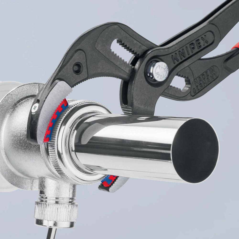 25-fach verstellbares, durchgestecktes Gelenk · Druckknopfverstellung · ergonomische Schenkelgeometrie · zum Anziehen und Lösen von Siphon-Verschraubungen, Kunststoff-Rohrverbindungen und runden Überwurfmuttern · Chrom-Vanadin-Elektrostahl, geschmiedet, ölgehärtet
